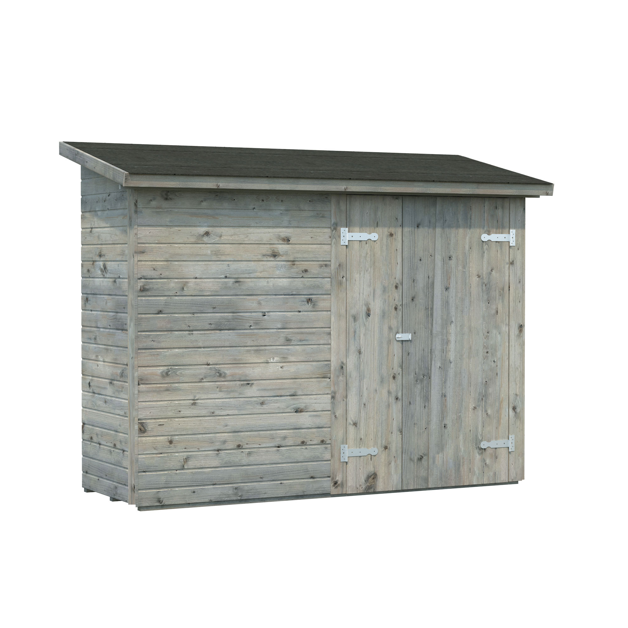 Färdiga väggelement i nordisk gran med en enkel pardörr. Obs! Förrådet är ämnat att byggas på befintlig vägg och har därför ingen egen bakvägg.