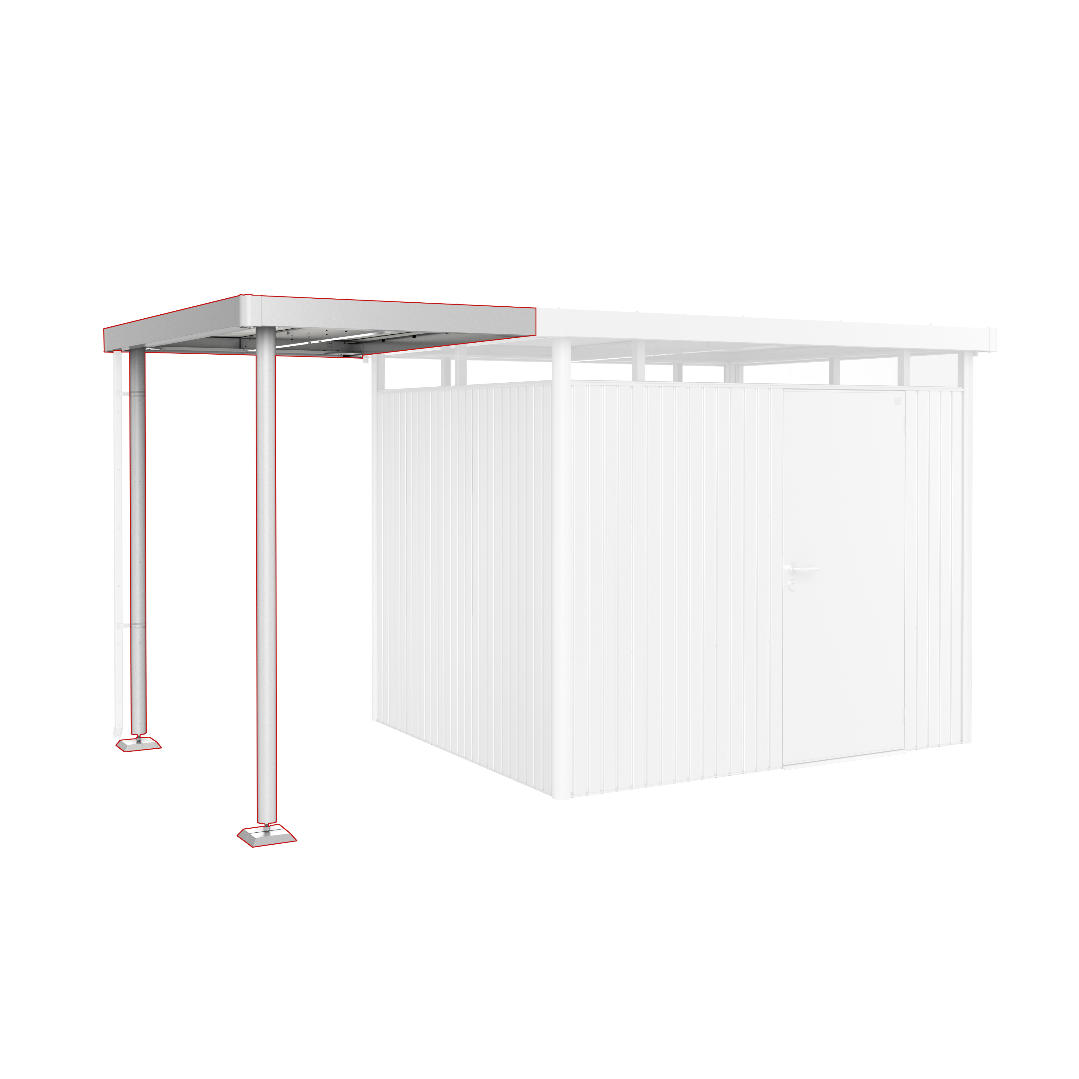 Sidotaket kan fästas på boden HighLine® (från storlek H2 och uppåt) på sidan med hängrännan – antingen på ena eller båda sidorna. Den finns i två olika storlekar. Sidotaket S är 150 cm brett och storlek L är 282 cm. Stödbenen i aluminium är utrustade med fötter som kan justeras i höjdled. Stuprör ingår.