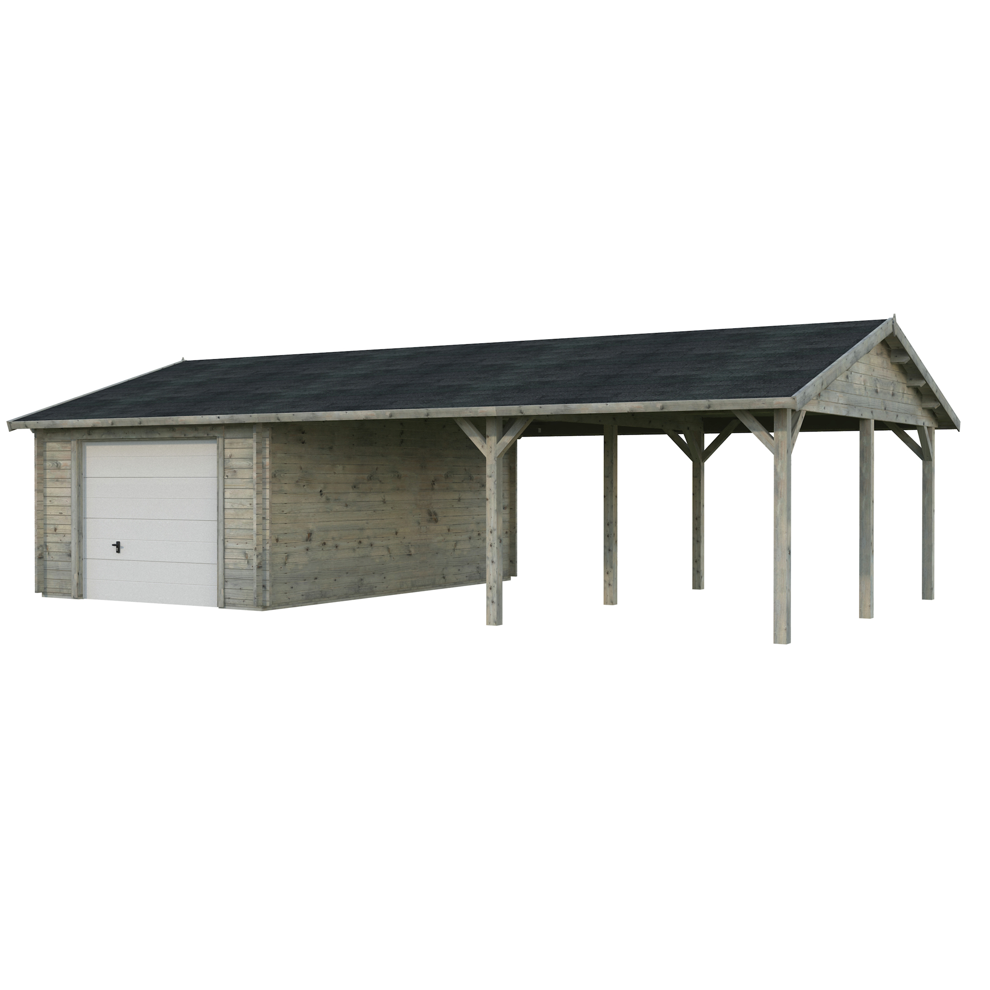 Palmakos garage Roger 19,0+33,2 m2 med solid 44 mm knuttimmervägg är inte bara den perfekta lösningen för att hålla din bil säkert inomhus, utan den har också funktionaliteten att behålla dina familjefordon under den skyddande carporten, samtidigt som det ger extra utrymme för dina förvaringsbehov. De generösa måtten gör att du kan parkera din bil bekvämt och har extra utrymme för verktyg, cyklar och andra föremål.
