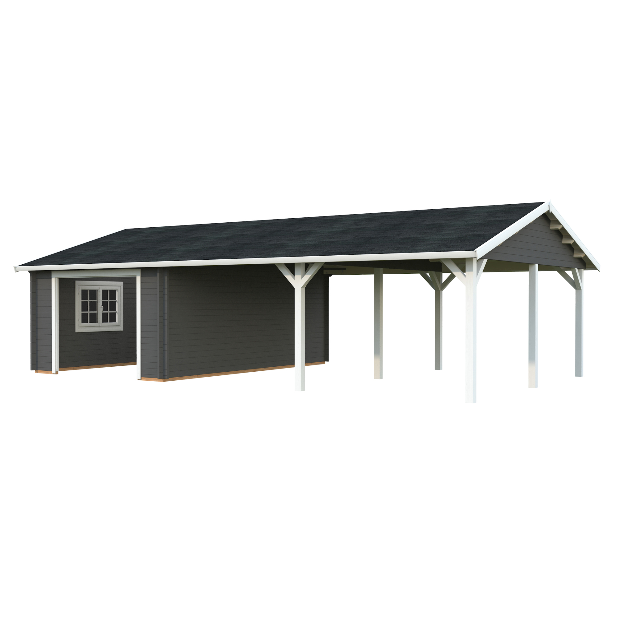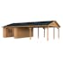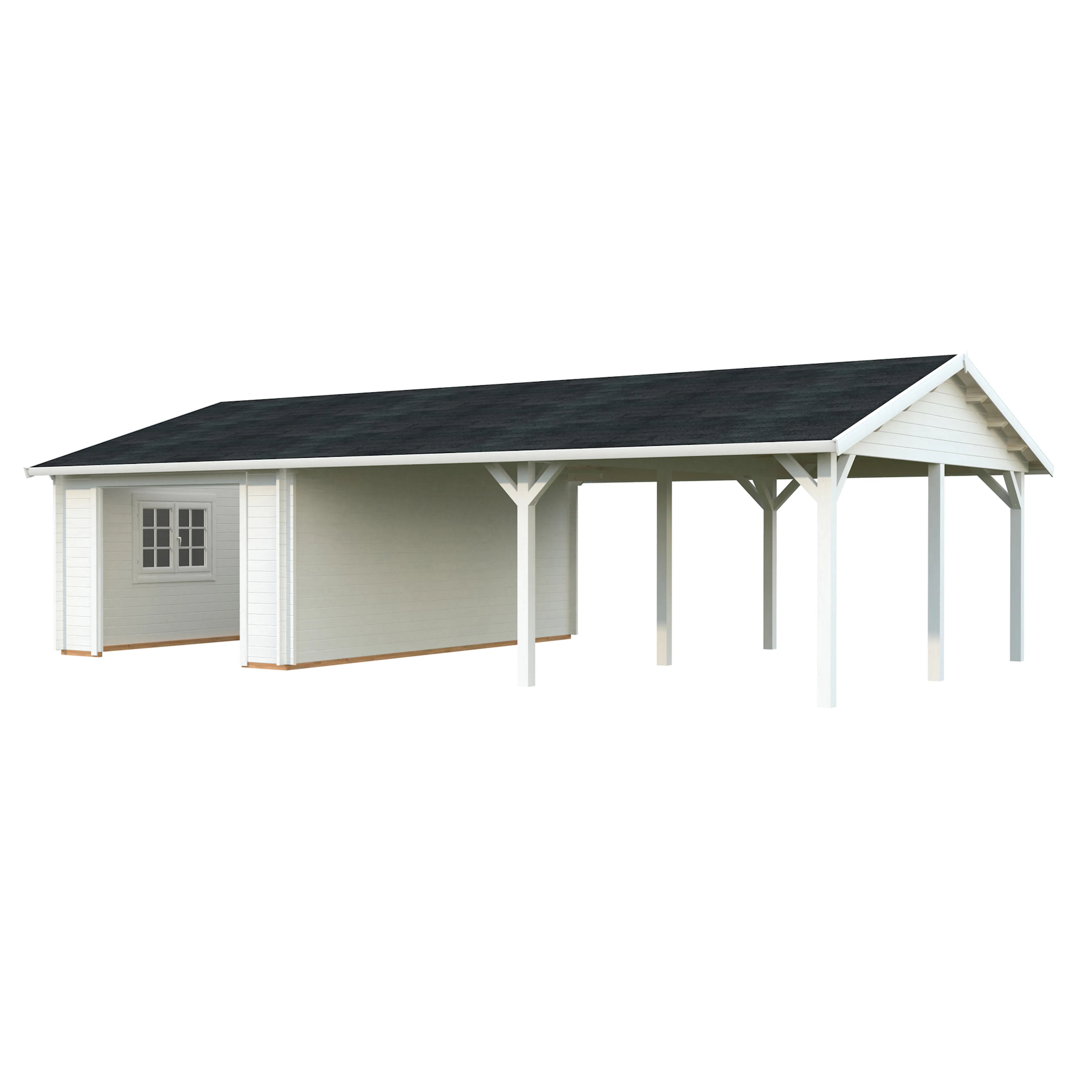 Palmakos garage Roger 19,0+33,2 m2 med solid 44 mm knuttimmervägg är inte bara den perfekta lösningen för att hålla din bil säkert inomhus, utan den har också funktionaliteten att behålla dina familjefordon under den skyddande carporten, samtidigt som det ger extra utrymme för dina förvaringsbehov. De generösa måtten gör att du kan parkera din bil bekvämt och har extra utrymme för verktyg, cyklar och andra föremål.