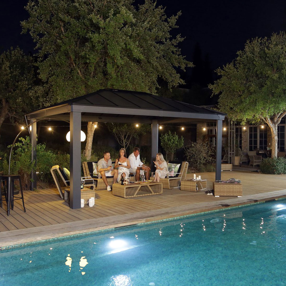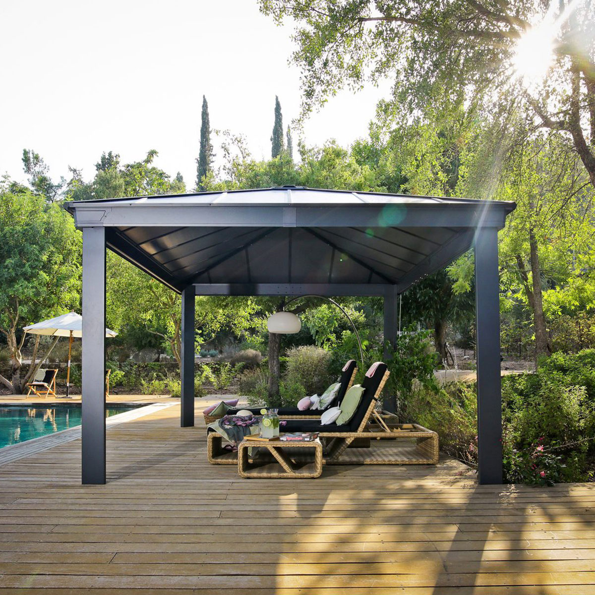 Paviljong Canopia by Palram Dallas Antracitgrå är en trädgårdspaviljong som erbjuder ett skuggigt område året runt. Det är en perfekt plats för sommarens grillfester.