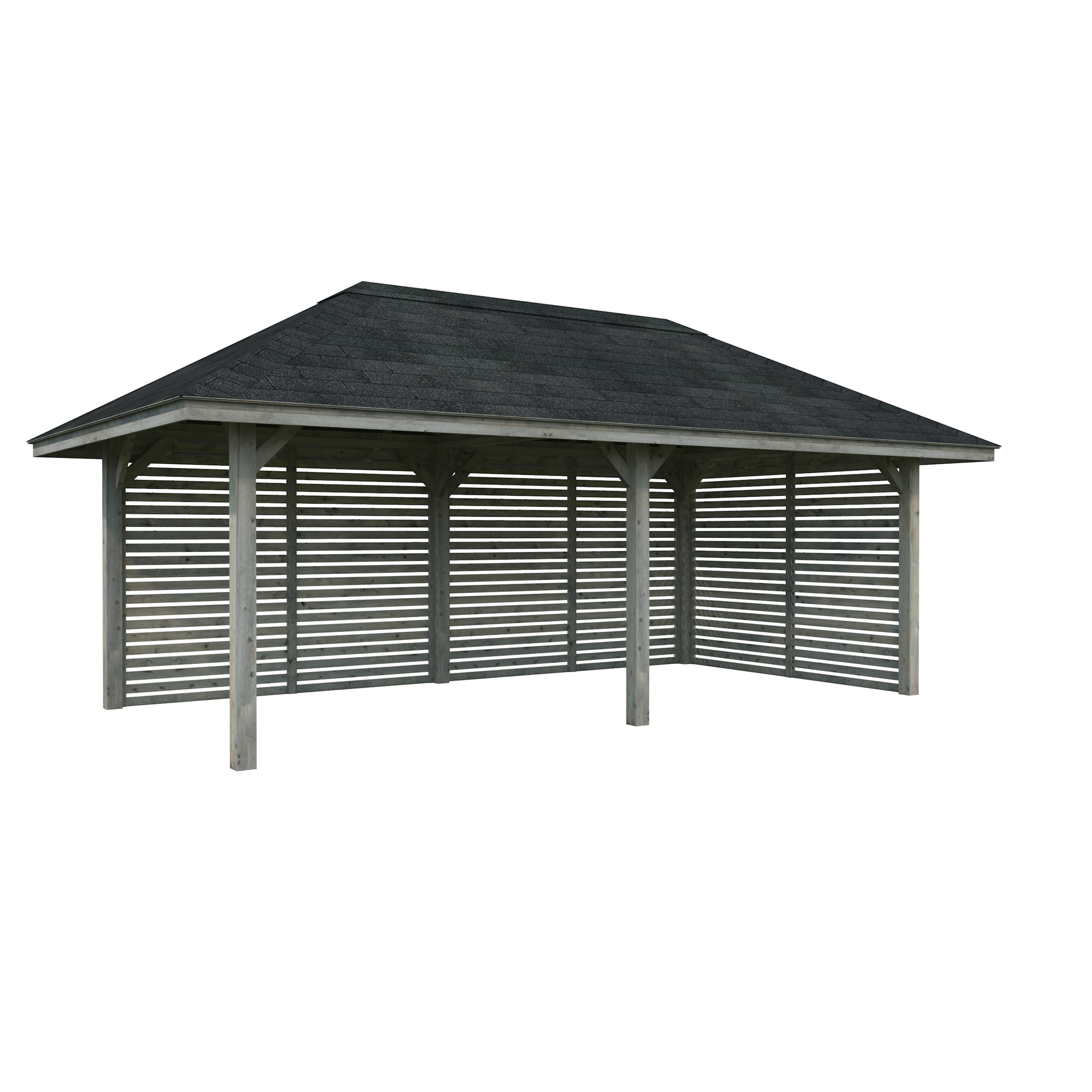 Levereras som byggsats med alla infästningar. Jalusiväggar släpper in ljus men ger ändå skydd mot insyn och sol.
