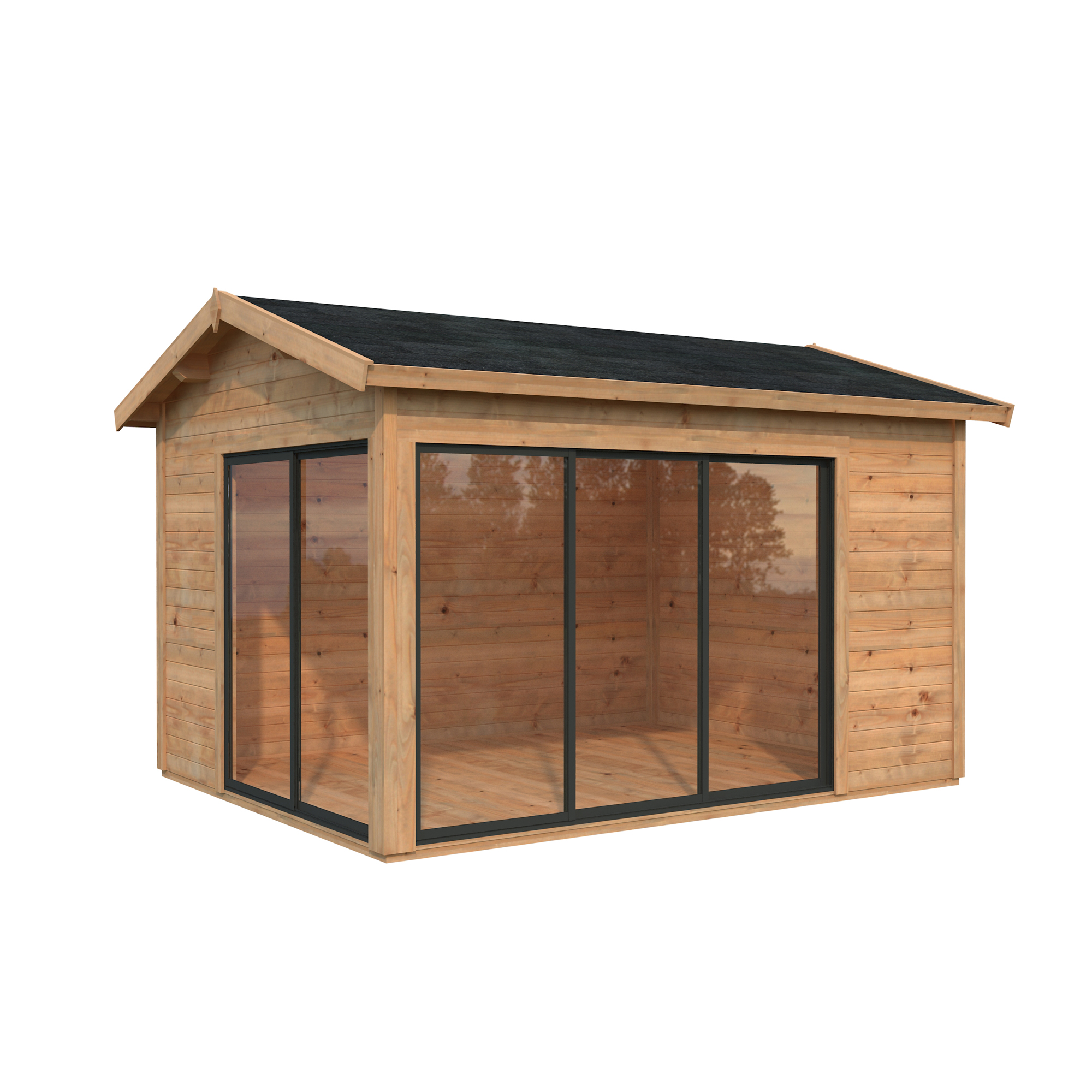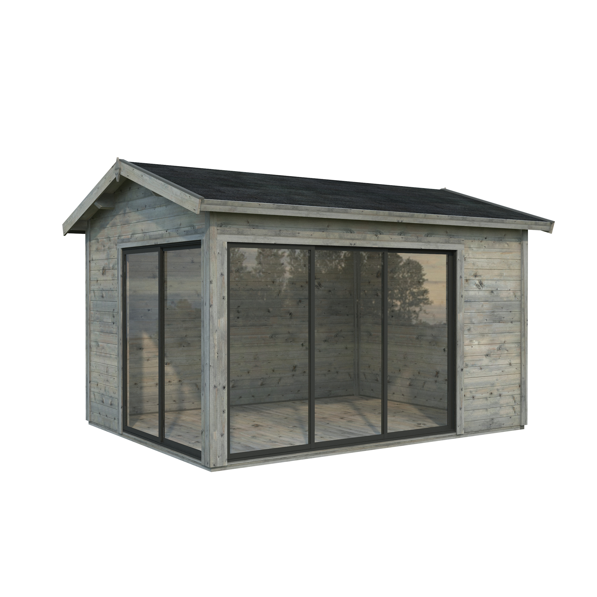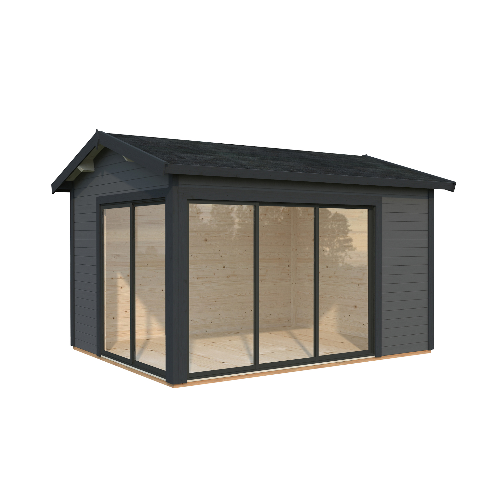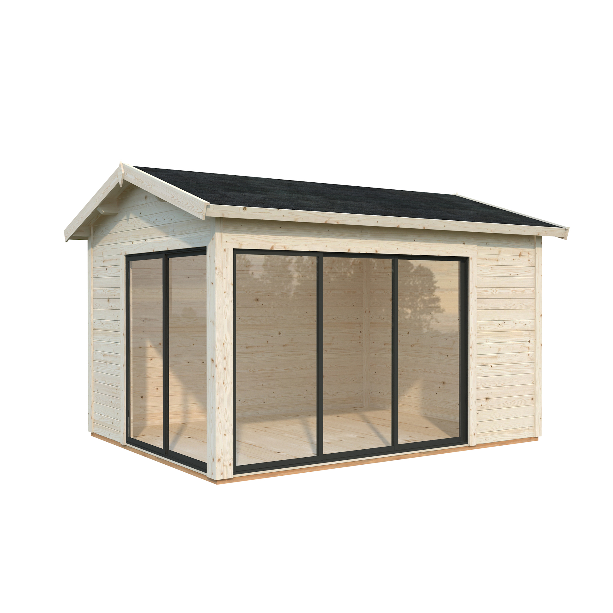 Palmakos stuga Amanda 11,2 m² Slide är ett mångsidigt och modernt trädgårdshus som passar perfekt för olika användningsområden. Med sina 44 mm tjocka väggar och sadeltak erbjuder den ett stilrent utseende. De två uppsättningarna av skjutdörrar i aluminium och härdat säkerhetsglas ger både en elegant design och ett bra ljusinsläpp, vilket gör den till ett ljust och luftigt utrymme.