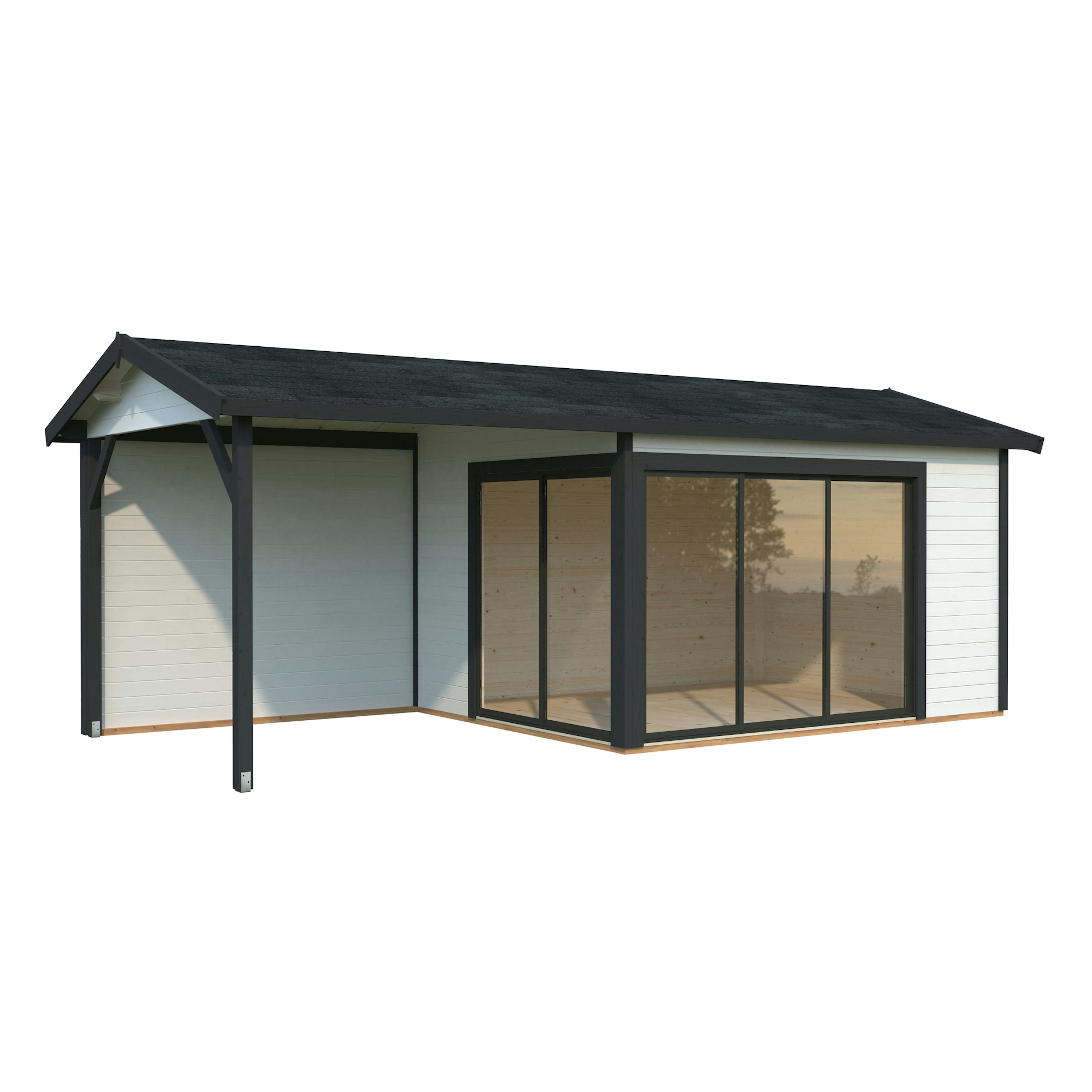 Palmakos stuga Amanda 11,2 + 7,8 m² Slide är ett mångsidigt och modernt trädgårdshus som passar perfekt för olika användningsområden. Med sina 44 mm tjocka väggar och sadeltak erbjuder den ett stilrent utseende. Med sina 11,2 m² ger den gott om utrymme för en rad aktiviteter, oavsett om du vill använda den som ett hobbyutrymme, för växter, konst, hantverk eller som en verkstad. Den kan även omvandlas till ett hemmakontor, en yoga- eller träningslokal, eller en mysig samlingsplats för vänner och familj.
