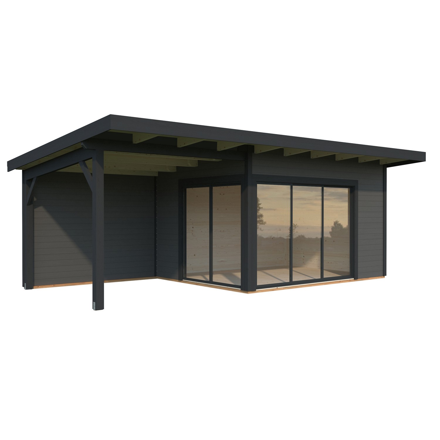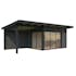 Stugan Andrea med förlängt flackt tak skapar ett modernt uttryck och blir ett stilfullt inslag i din trädgård. Skjutpartier finns även i två väggar så att dessa stora glasytorna släpper in generöst med ljus och tillåter fantastisk utsikt.