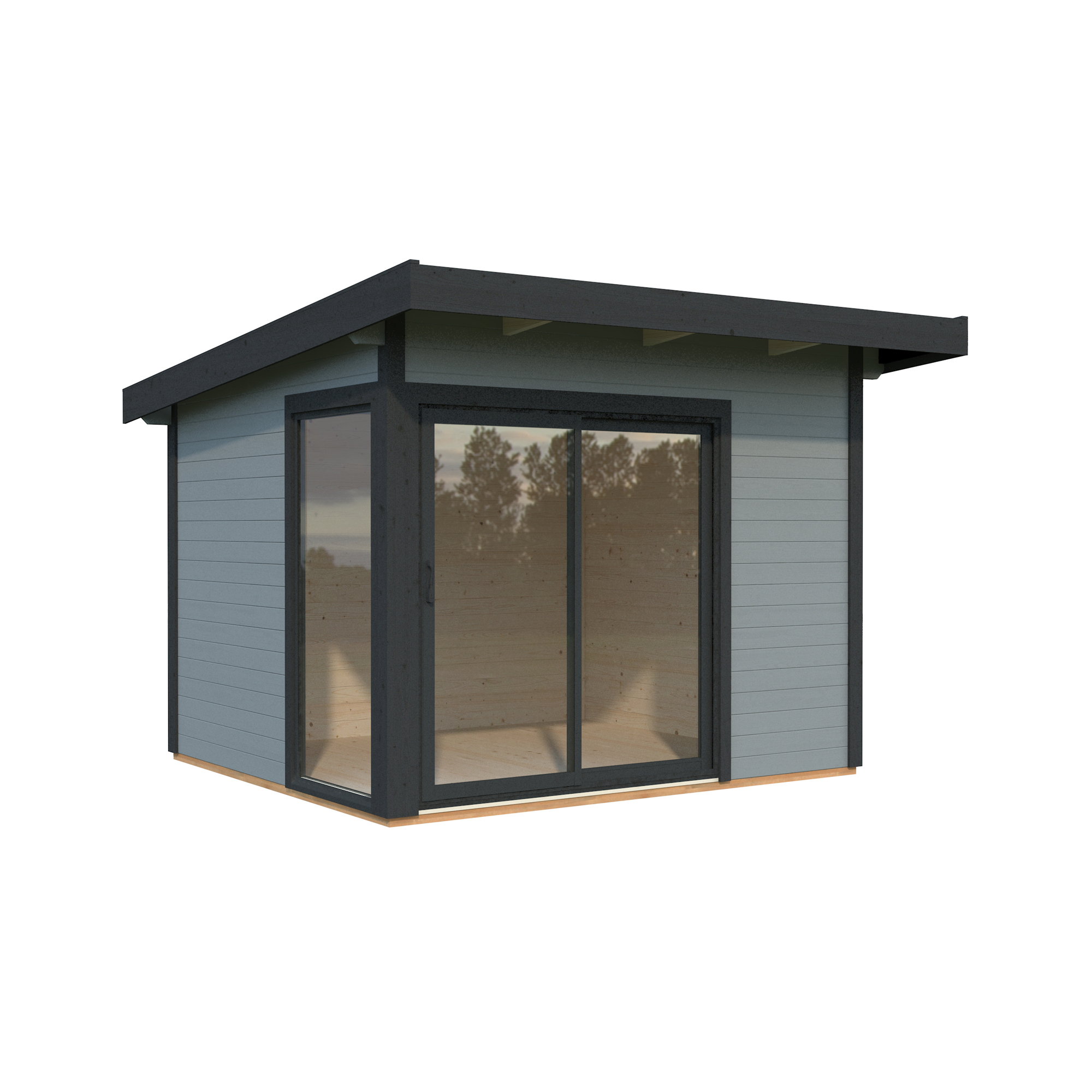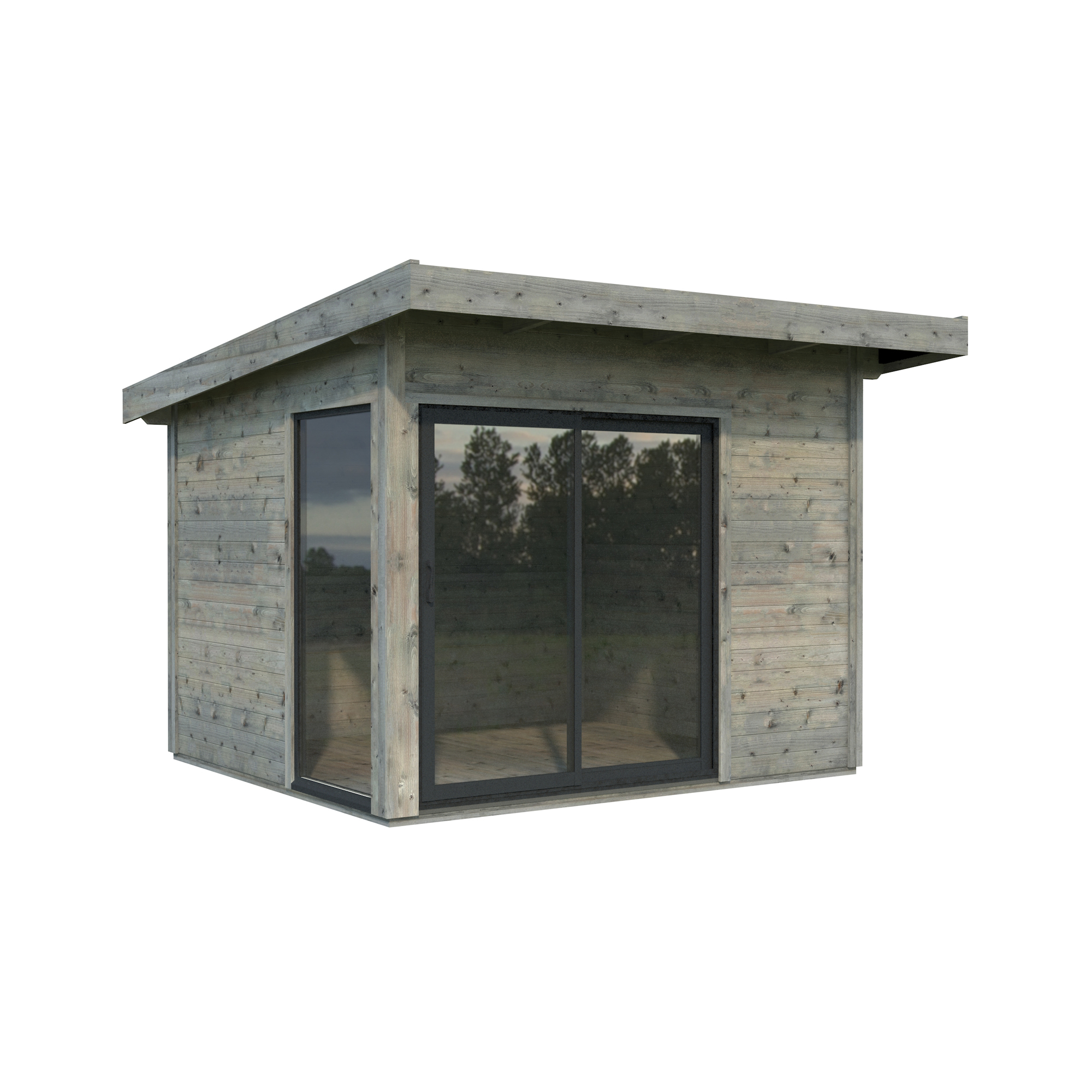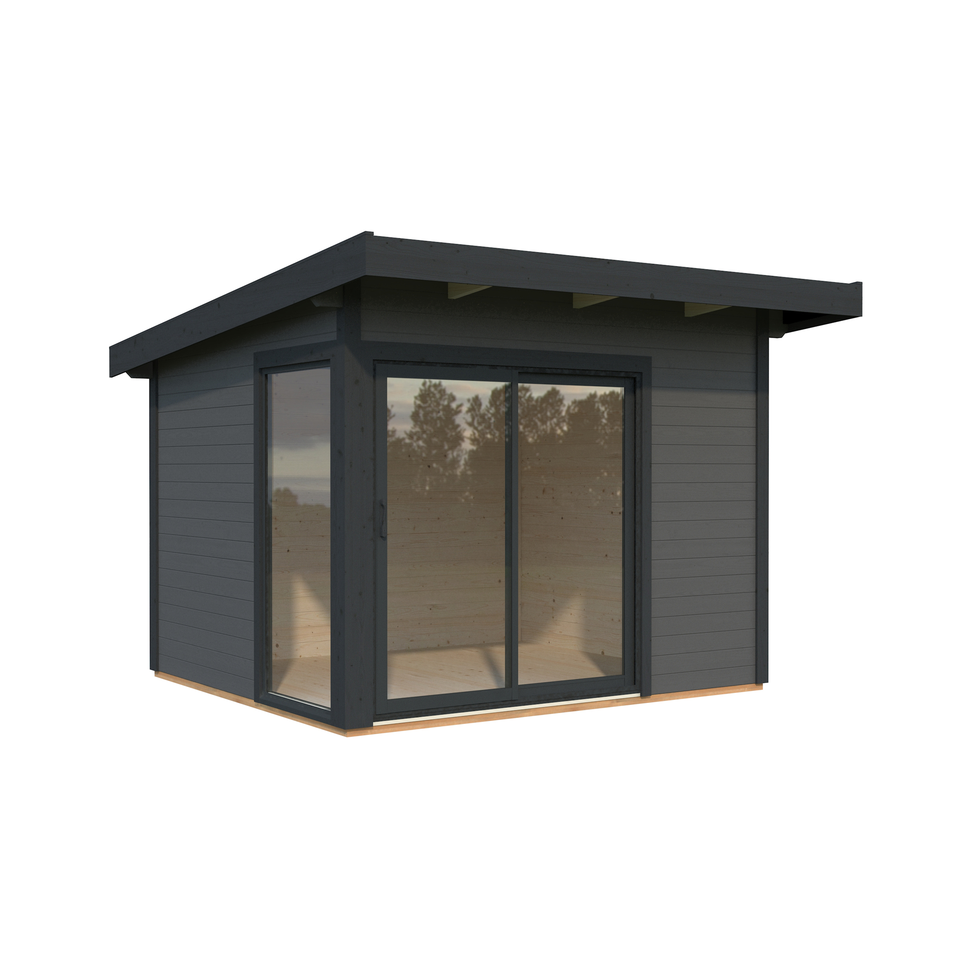Palmakos stuga Andrea 7,5 m² Slide Plus är ett modernt trädgårdshus med 44 mm tjocka väggar, flackt tak och 24 mm härdat energiglas i aluminium för skjutdörrar.