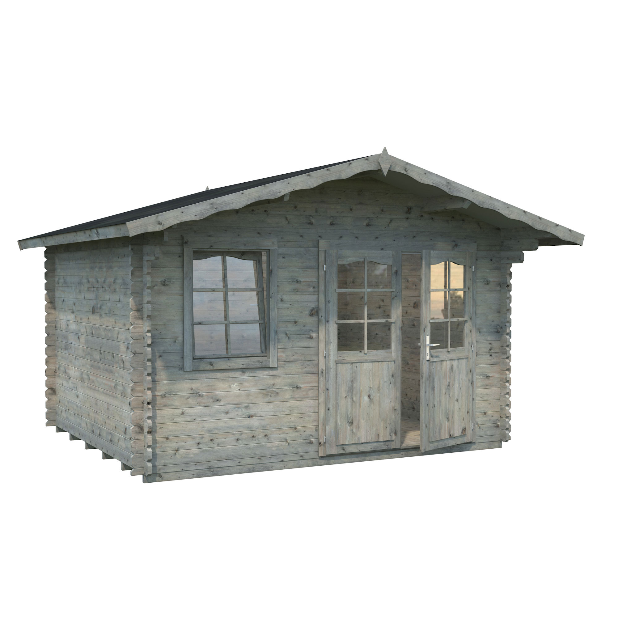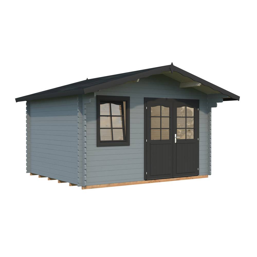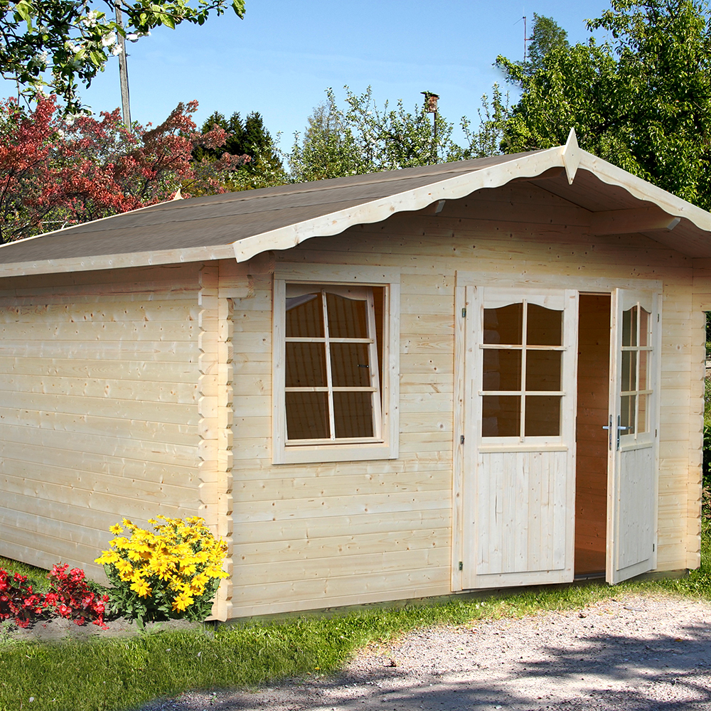 En ny stuga Caroline med modernt utseende. Stugan har utvändiga fönsterluckor som glider på två metallskenor och som kan skjutas för fönstren och skydda mot insyn eller ett besvärande solsken. Perfekt som gäststuga eller för sommarfester.