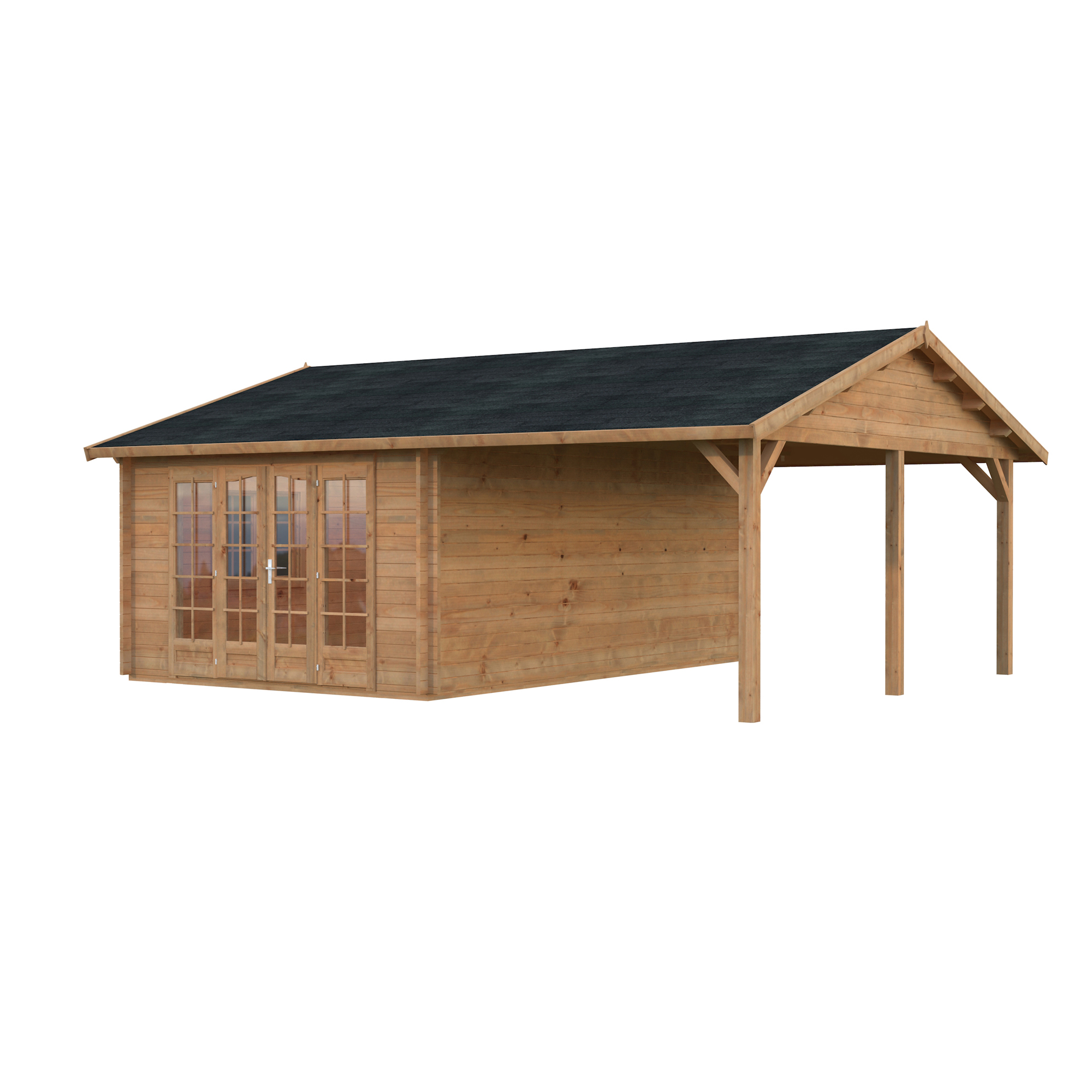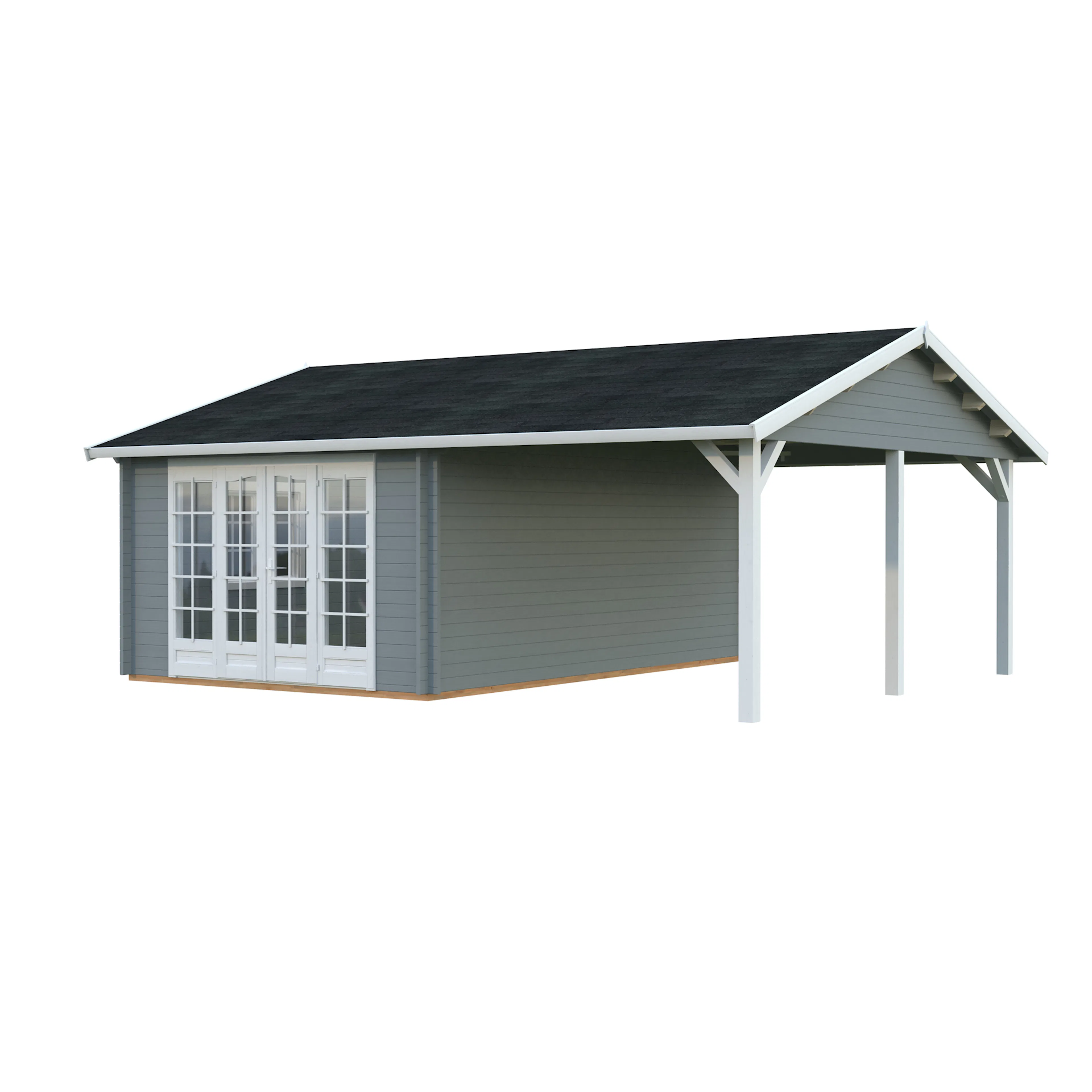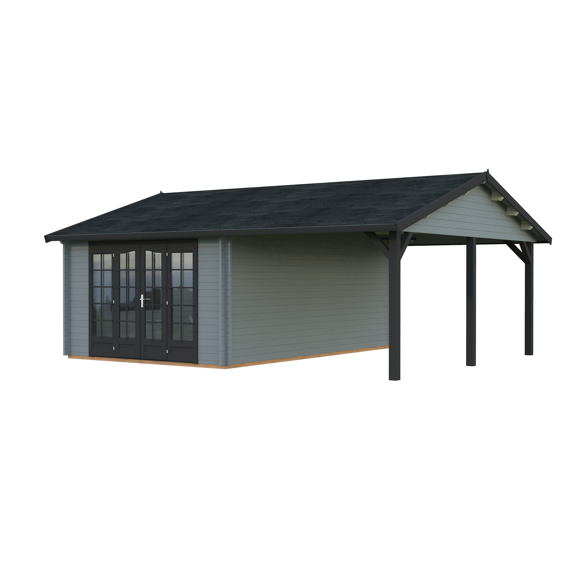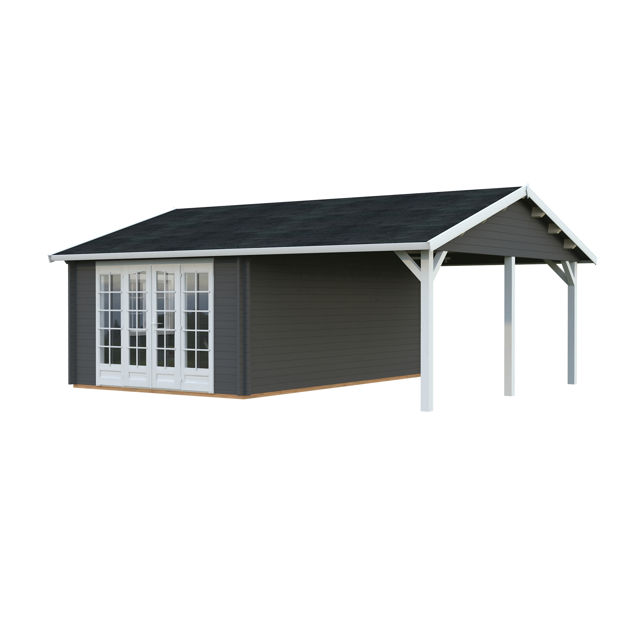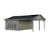 Palmakos stuga Irene 19,0+16,2 m² har ett klassiskt sadeltak och en rymlig takyta som är perfekt för att koppla av i trädgården, hålla små sammankomster, njuta av grillfest och middagsbjudningar. Den täckta takytan erbjuder gott om skydd för ditt utekök och trädgårdsmöbler. Den är idealisk för alla som vill skapa ett mångsidigt och bekvämt friluftsliv. Detta trädgårdshus kombinerar modern design med praktisk funktionalitet, vilket gör det perfekt för en mängd olika användningsområden.