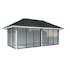 Tillverkad av nordisk gran med 120x120 mm starka limträstolpar och 19 mm takbrädor. Låsbara skjutdörrarna i 24 mm härdat dubbelglas (4 mm härdat glas - 16 mm luftspalt - 4 mm härdat glas) monterat i solida aluminiumprofiler. 28 mm väggstockar.