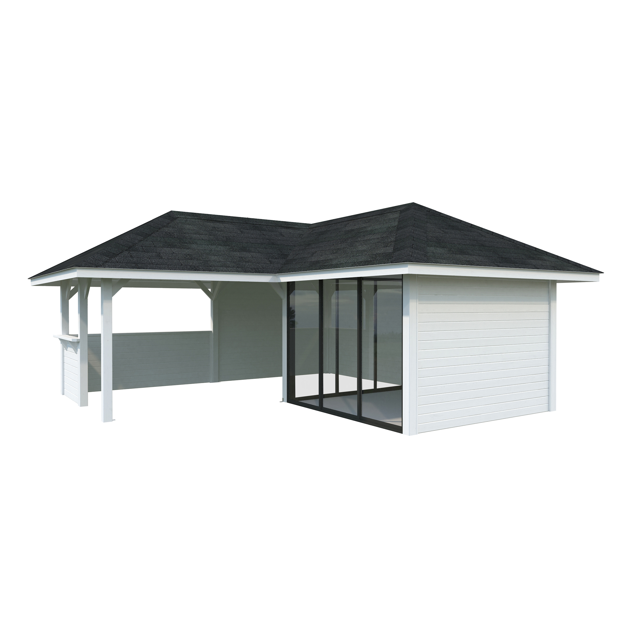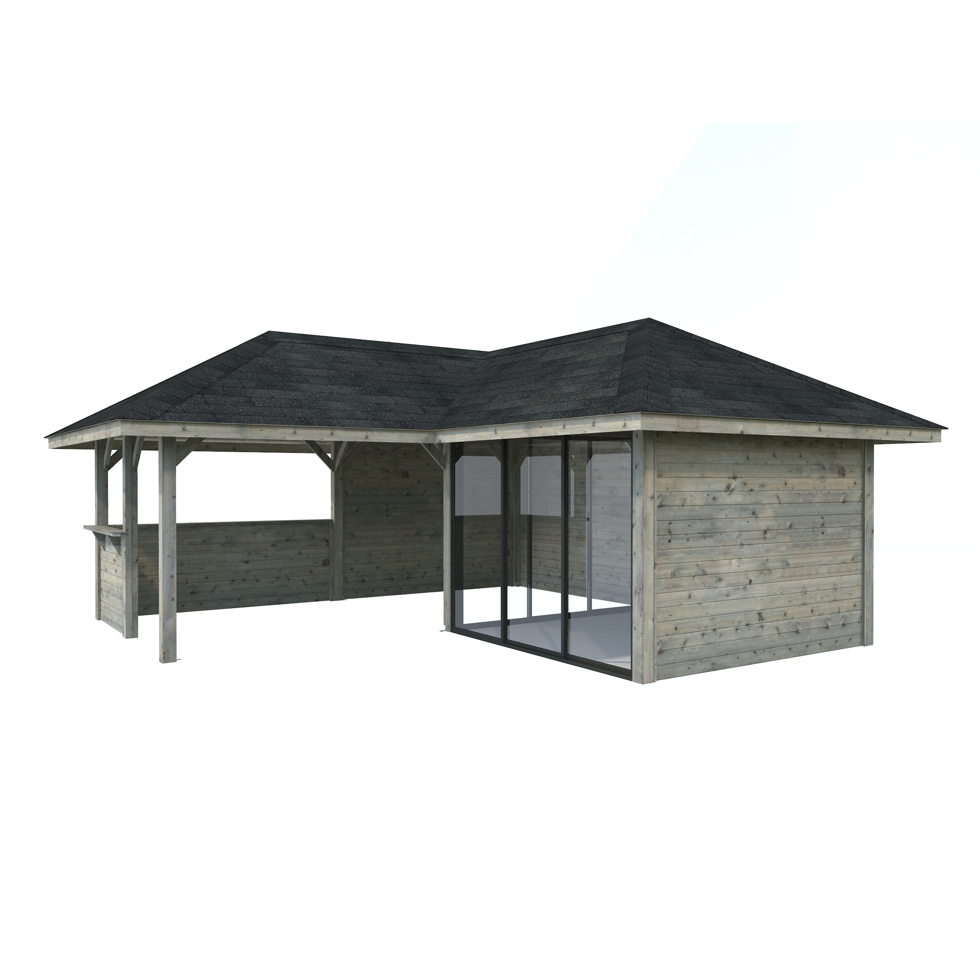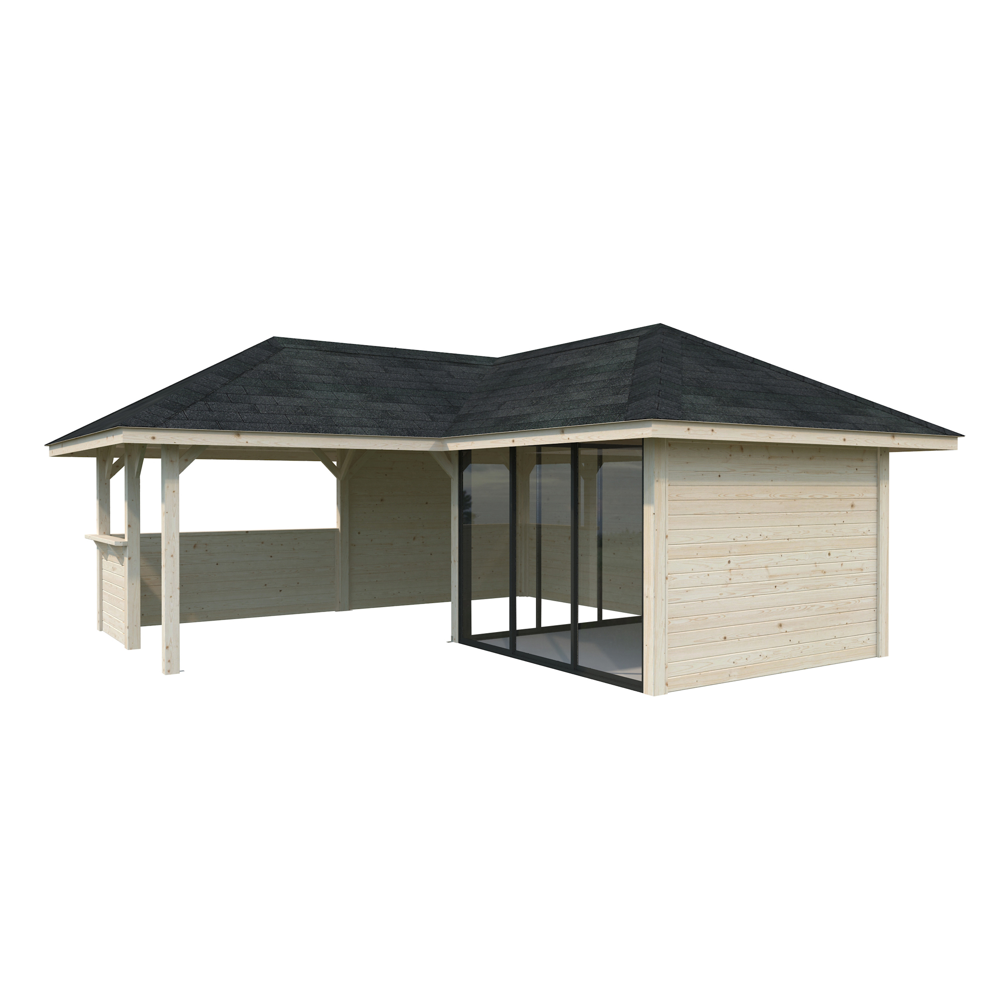Tillverkad av nordisk gran med 120x120 mm starka limträstolpar och 19 mm takbrädor. Låsbara skjutdörrarna i 4 mm härdat glas och aluminium. 28 mm väggstockar.
