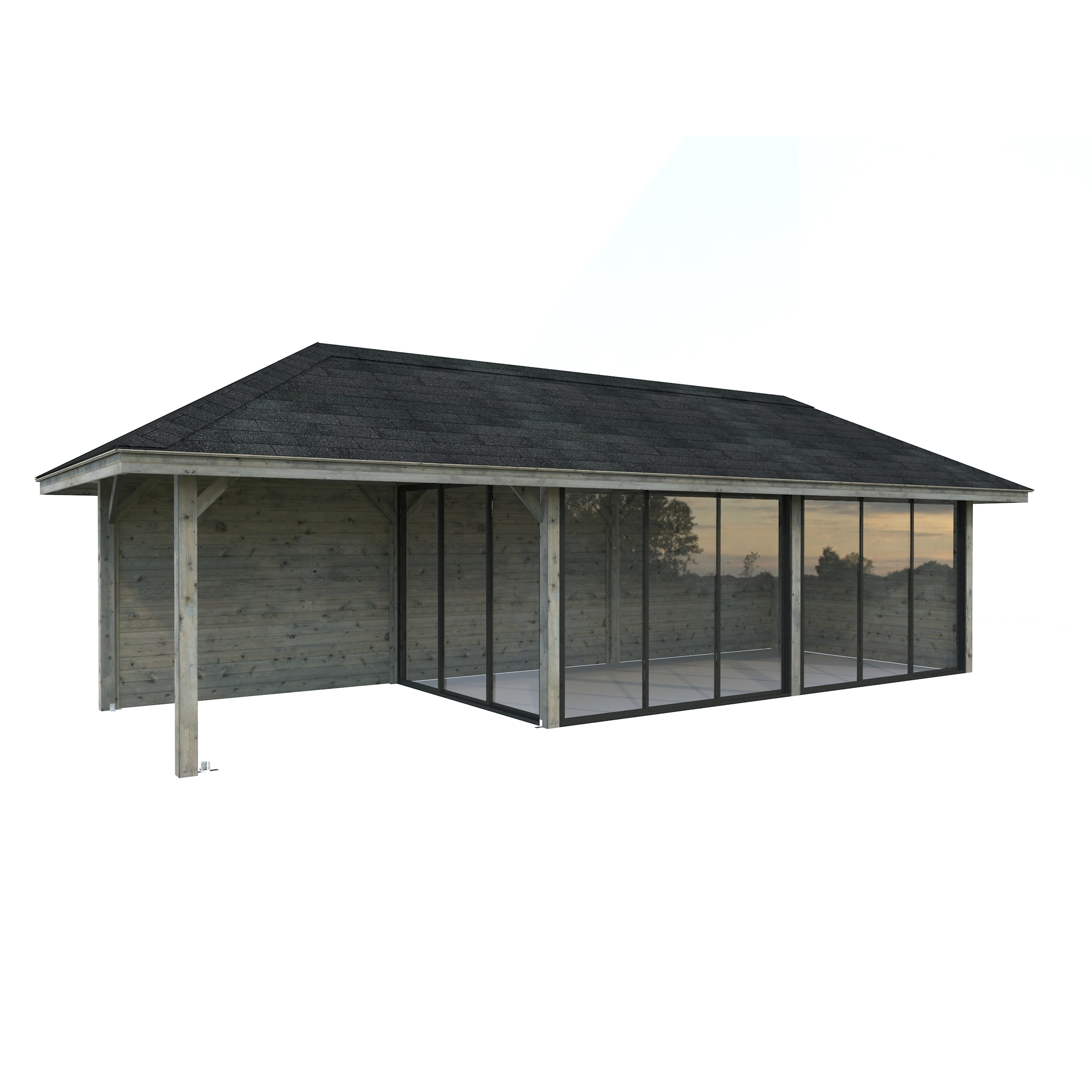Tillverkad av nordisk gran med 120x120 mm starka limträstolpar och 19 mm takbrädor. Låsbara skjutdörrarna i 4 mm härdat glas och aluminium. 28 mm väggstockar.