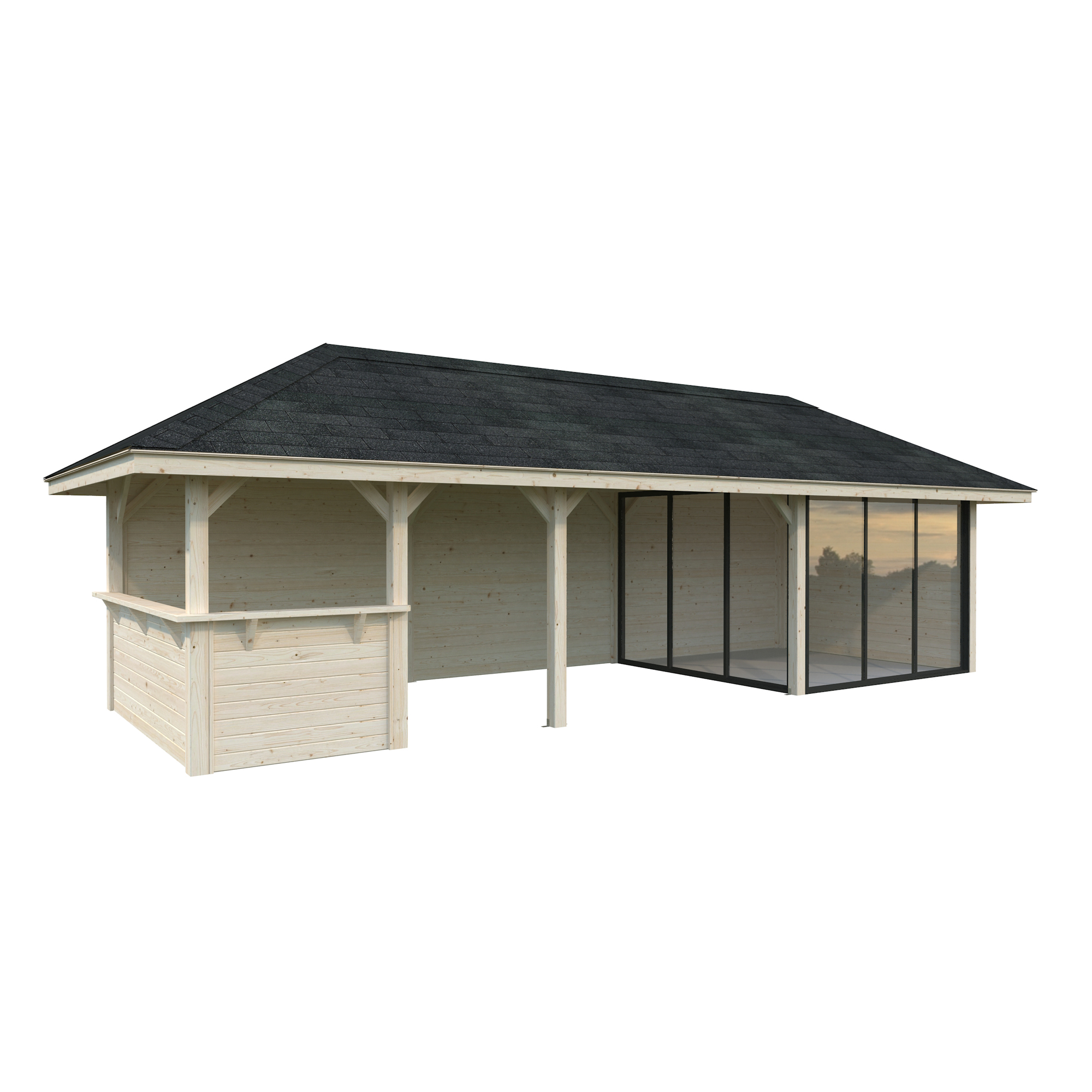 Tillverkad av nordisk gran med 120x120 mm starka limträstolpar och 19 mm takbrädor. Låsbara skjutdörrarna i 24 mm härdat dubbelglas (4 mm härdat glas - 16 mm luftspalt - 4 mm härdat glas) monterat i solida aluminiumprofiler. 28 mm väggstockar.