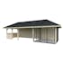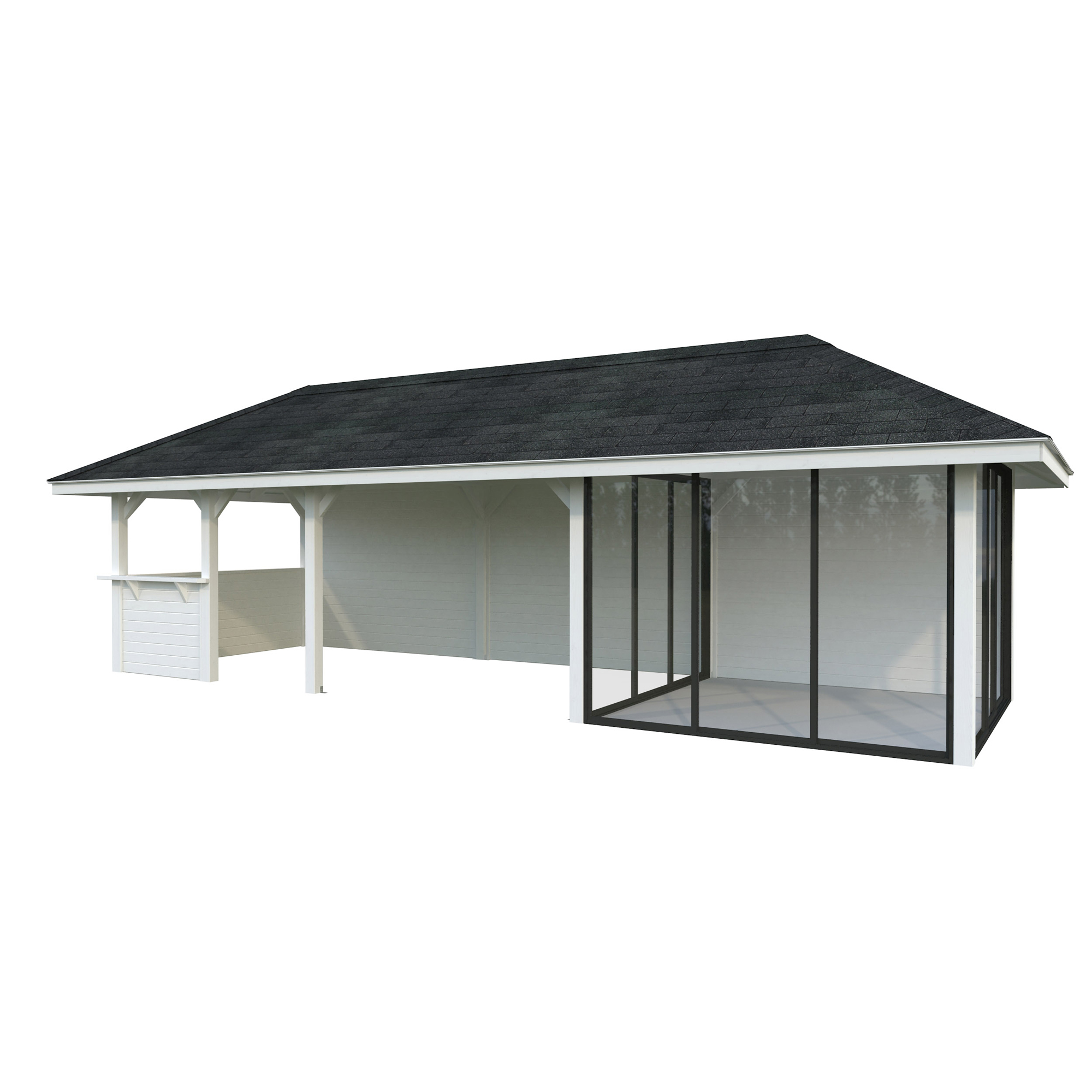 Tillverkad av nordisk gran med 120x120 mm starka limträstolpar och 19 mm takbrädor. Låsbara skjutdörrarna i 24 mm härdat dubbelglas (4 mm härdat glas - 16 mm luftspalt - 4 mm härdat glas) monterat i solida aluminiumprofiler. 28 mm väggstockar.