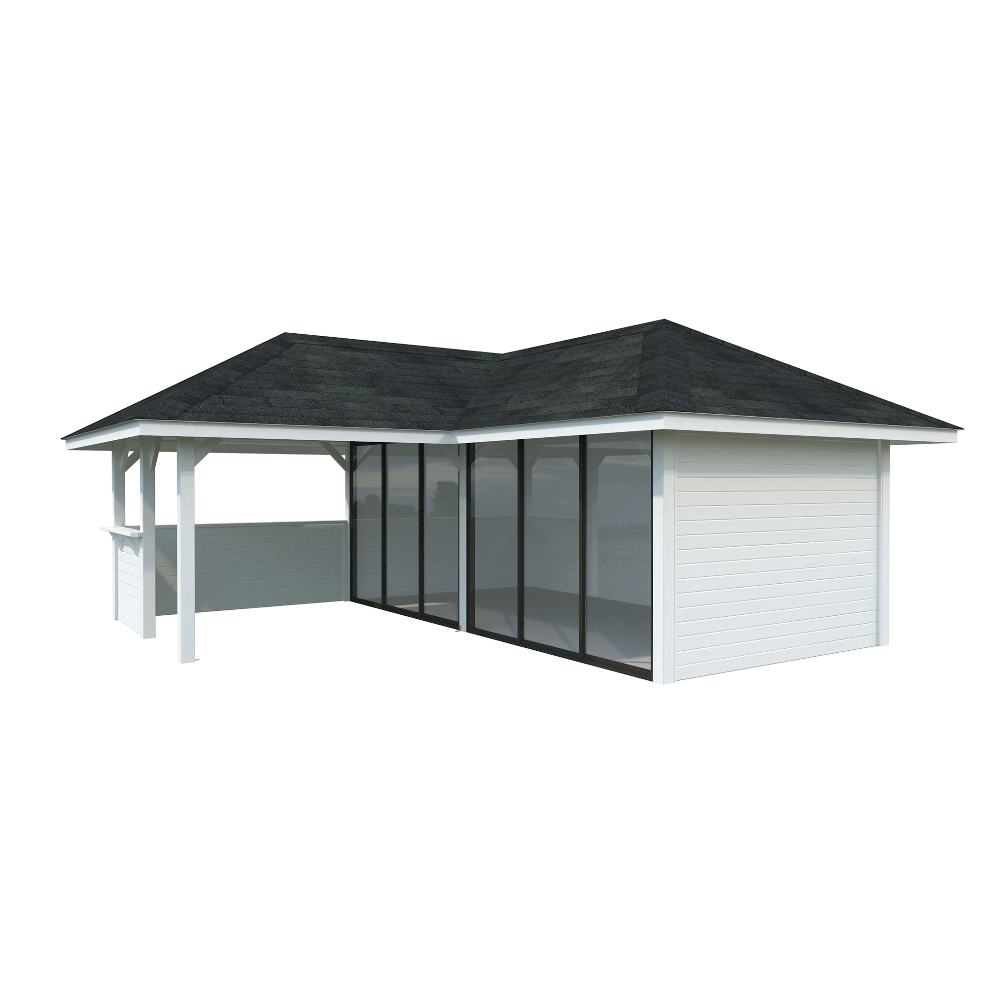 Tillverkad av nordisk gran med 120x120 mm starka limträstolpar och 19 mm takbrädor. Låsbara skjutdörrarna i 24 mm härdat dubbelglas (4 mm härdat glas - 16 mm luftspalt - 4 mm härdat glas) monterat i solida aluminiumprofiler. 28 mm väggstockar.
