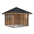 Tillverkad av nordisk gran med 120x120 mm starka limträstolpar och 19 mm takbrädor. Låsbara skjutdörrarna i 24 mm härdat dubbelglas (4 mm härdat glas - 16 mm luftspalt - 4 mm härdat glas) monterat i solida aluminiumprofiler. 28 mm väggstockar.