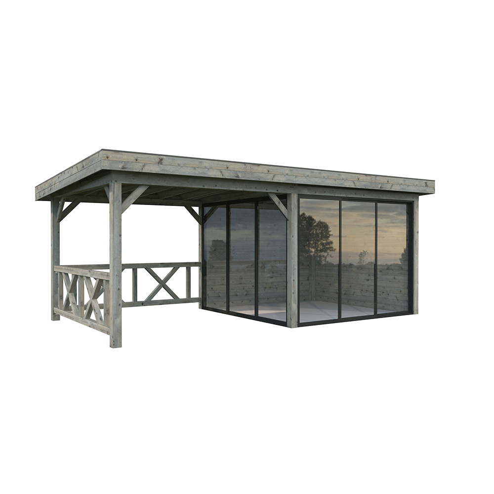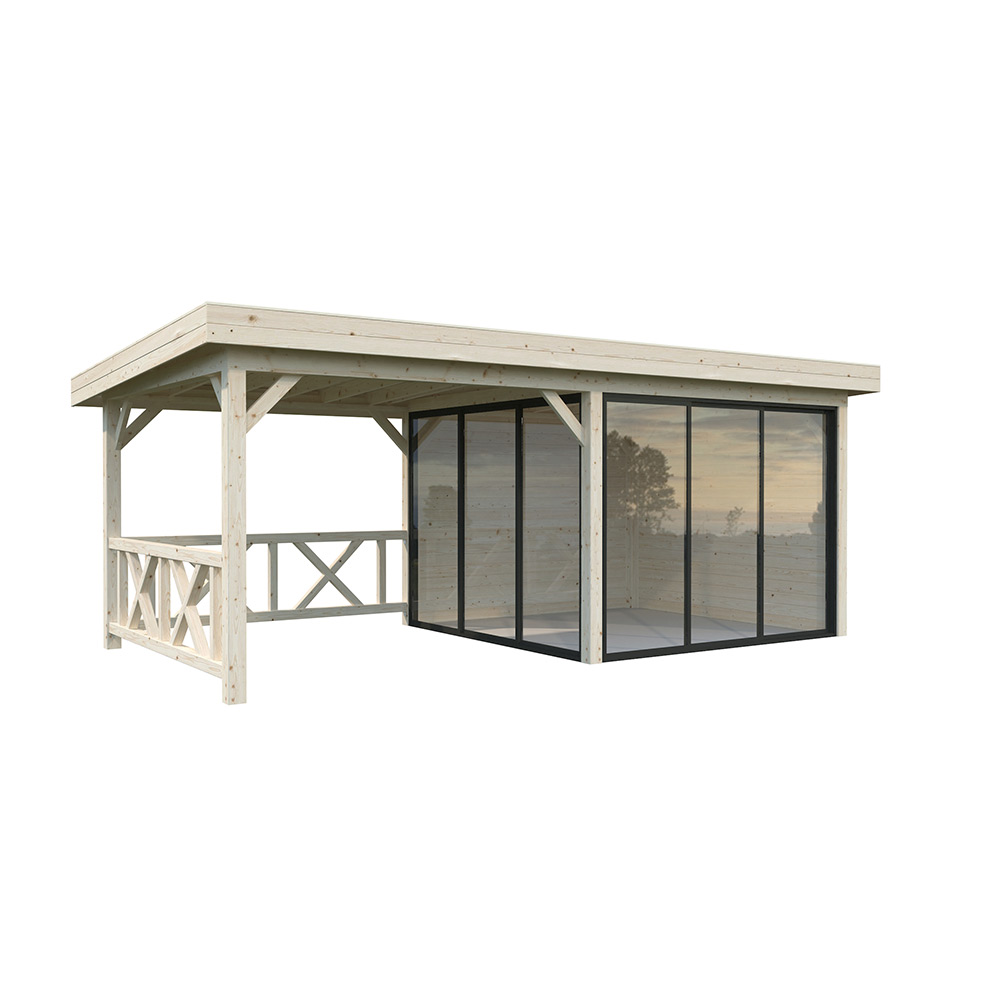 Tillverkad av nordisk gran med 120x120 mm starka limträstolpar och 19 mm takbrädor. Låsbara skjutdörrarna i 4 mm härdat glas och aluminium. 28 mm väggstockar.