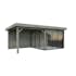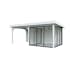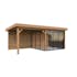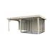 Tillverkad av nordisk gran med 120x120 mm starka limträstolpar och 19 mm takbrädor. Låsbara skjutdörrarna i 4 mm härdat glas och aluminium. 28 mm väggstockar.