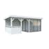 Tillverkad av nordisk gran med 120x120 mm starka limträstolpar och 19 mm takbrädor. Låsbara skjutdörrarna i 4 mm härdat glas och aluminium. 28 mm väggstockar.