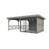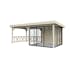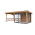 Tillverkad av nordisk gran med 120x120 mm starka limträstolpar och 19 mm takbrädor. Låsbara skjutdörrarna i 24 mm härdat dubbelglas (4 mm härdat glas - 16 mm luftspalt - 4 mm härdat glas) monterat i solida aluminiumprofiler. 28 mm väggstockar.
