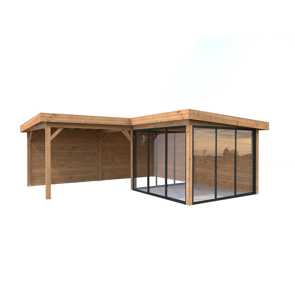 Tillverkad av nordisk gran med 120x120 mm starka limträstolpar och 19 mm takbrädor. Låsbara skjutdörrarna i 4 mm härdat glas och aluminium. 28 mm väggstockar. Rymligt skydd under tak.