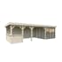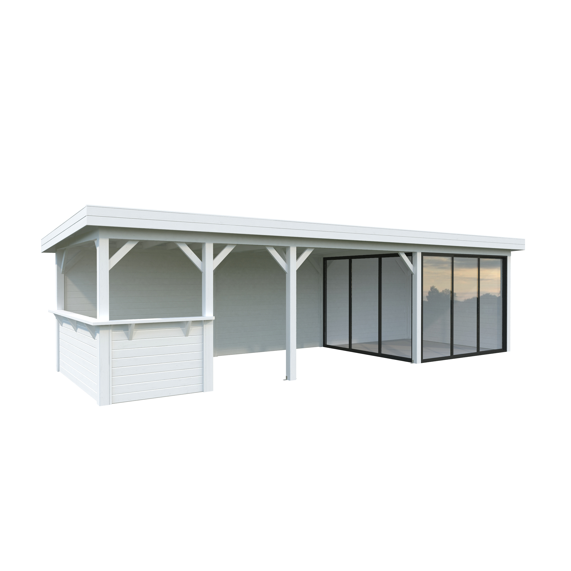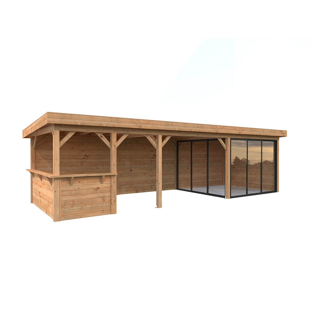 Tillverkad av nordisk gran med 120x120 mm starka limträstolpar och 19 mm takbrädor. Låsbara skjutdörrarna i 4 mm härdat glas och aluminium. 28 mm väggstockar. Jalusivägg.