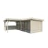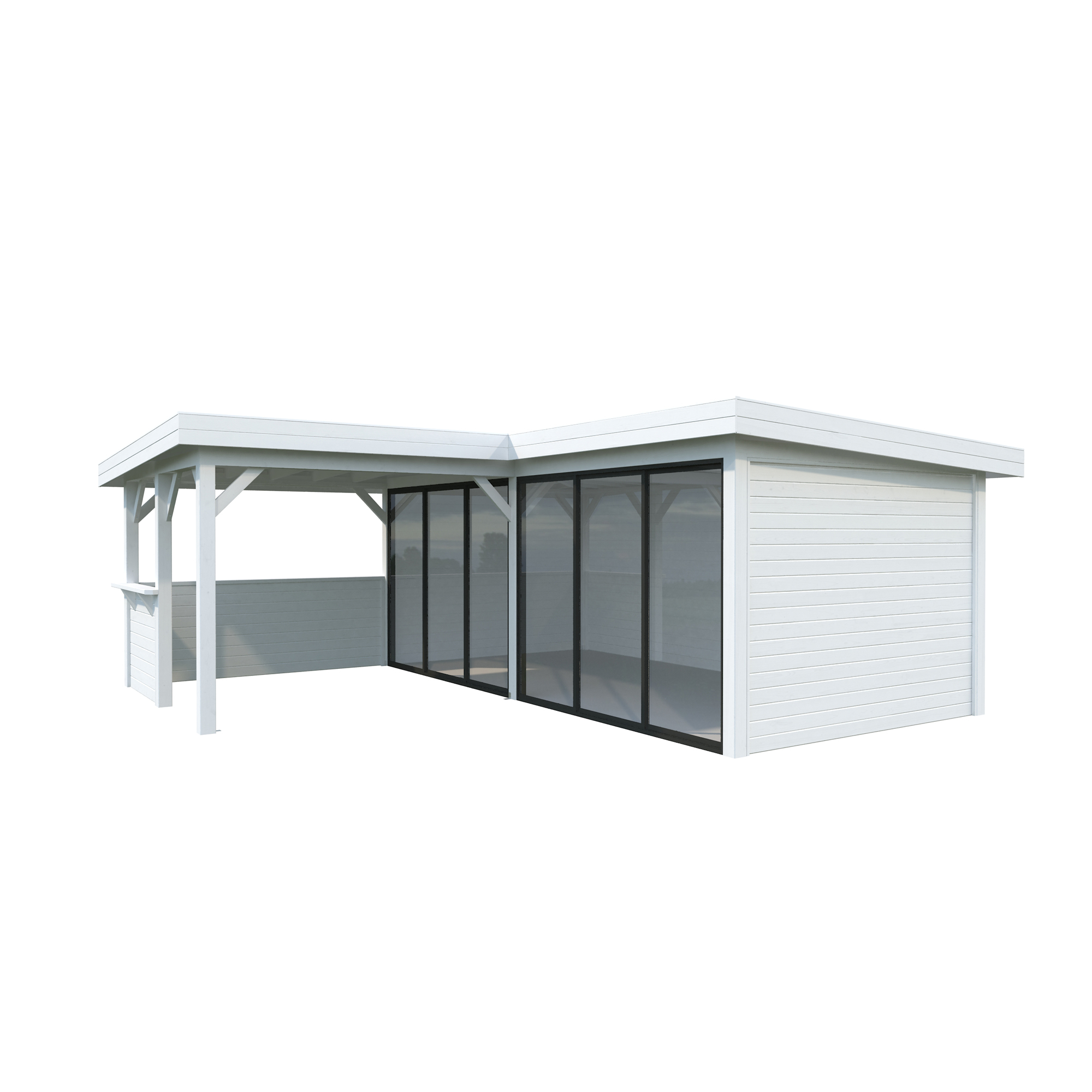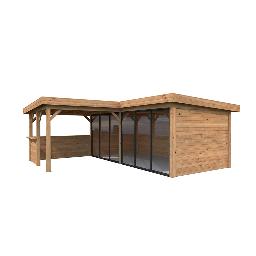 Tillverkad av nordisk gran med 120x120 mm starka limträstolpar och 19 mm takbrädor. Låsbara skjutdörrarna i 4 mm härdat glas och aluminium. 28 mm väggstockar. Jalusivägg.