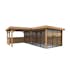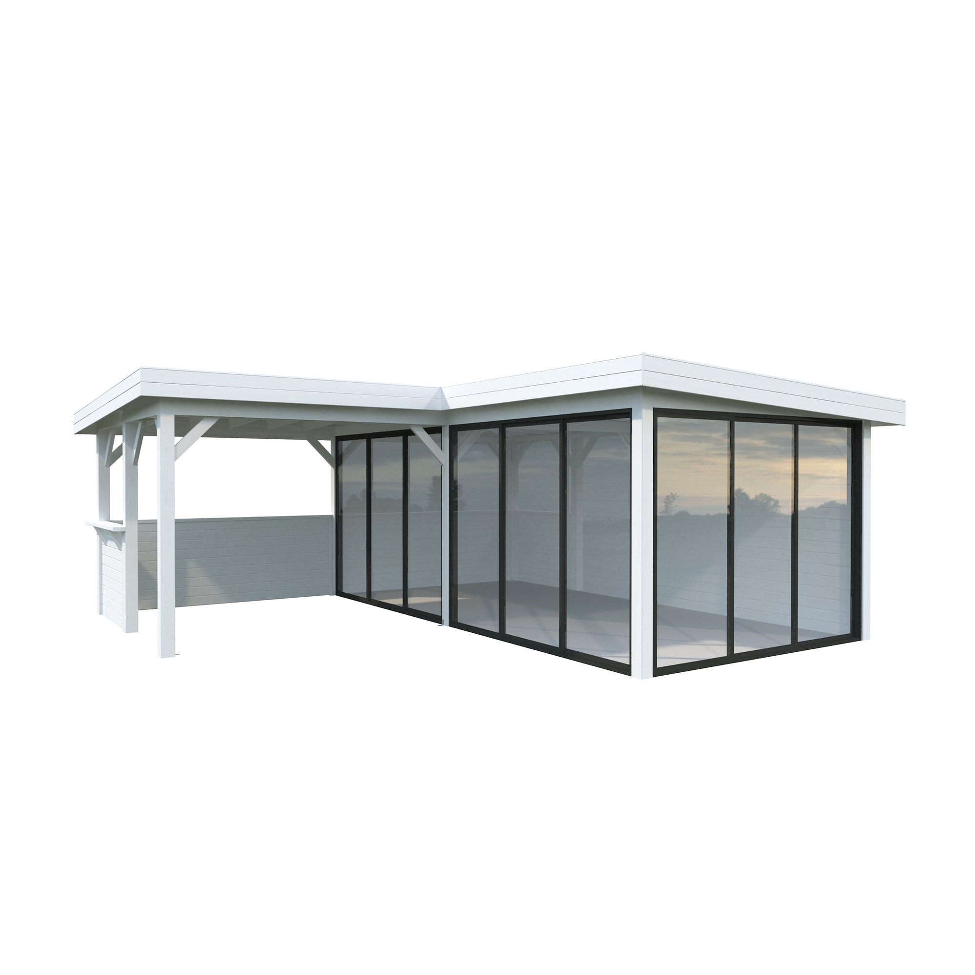 Tillverkad av nordisk gran med 120x120 mm starka limträstolpar och 19 mm takbrädor. Låsbara skjutdörrarna i 4 mm härdat glas och aluminium. 28 mm väggstockar.