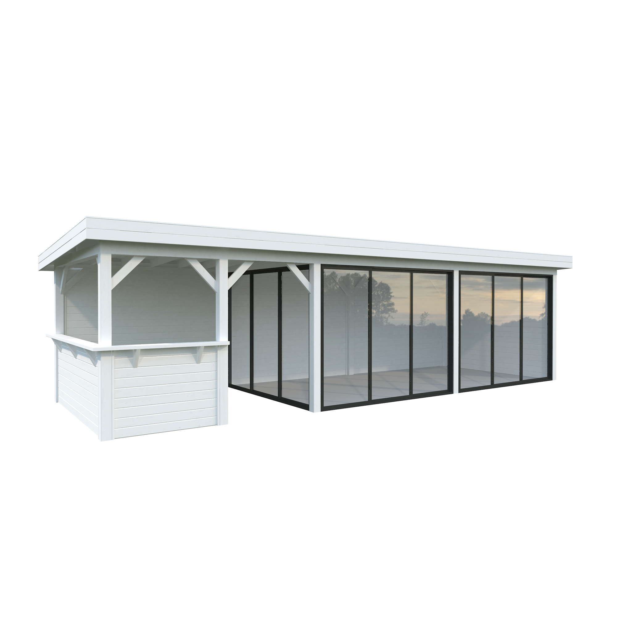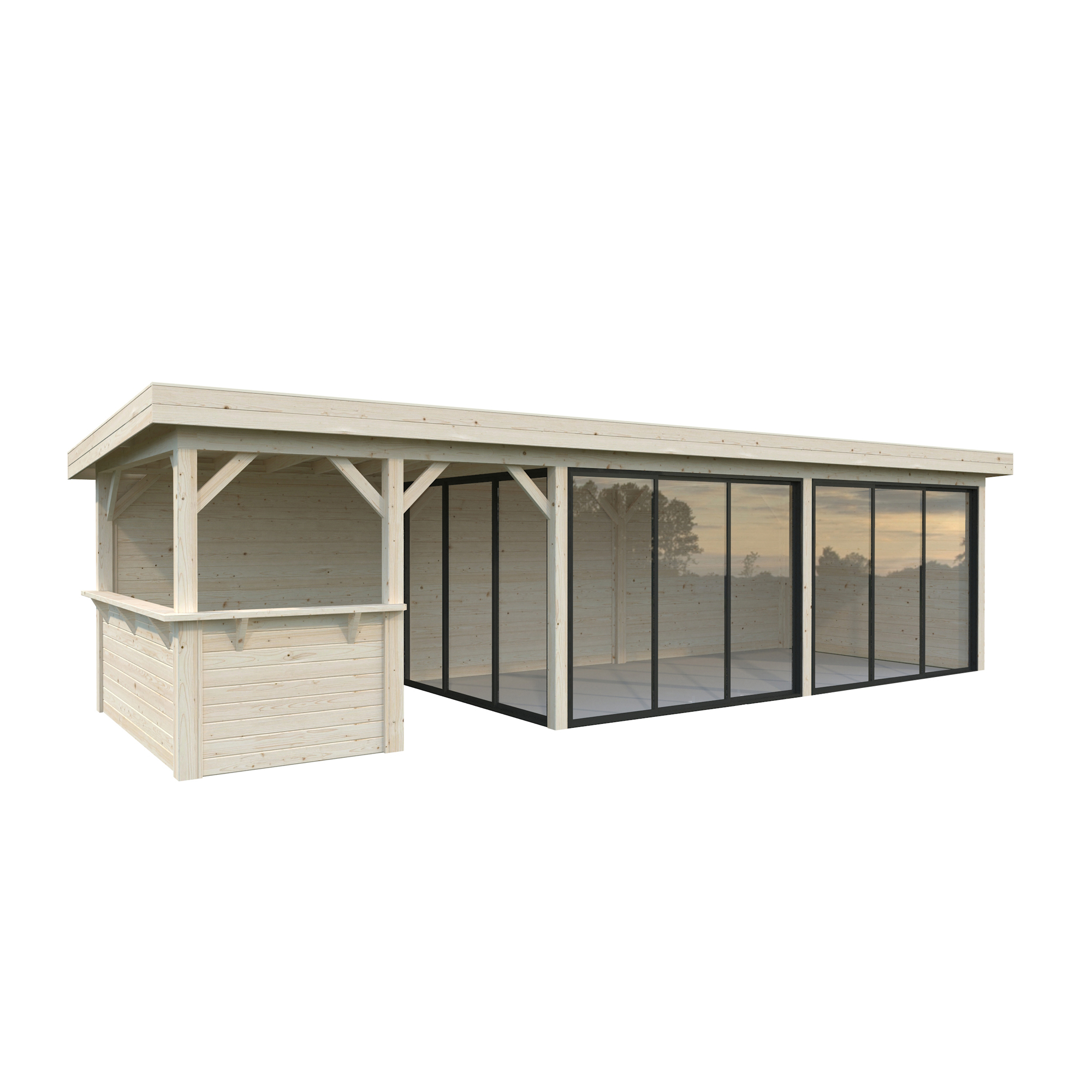 Tillverkad av nordisk gran med 120x120 mm starka limträstolpar och 19 mm takbrädor. Låsbara skjutdörrarna i 24 mm härdat dubbelglas (4 mm härdat glas - 16 mm luftspalt - 4 mm härdat glas) monterat i solida aluminiumprofiler. 28 mm väggstockar.