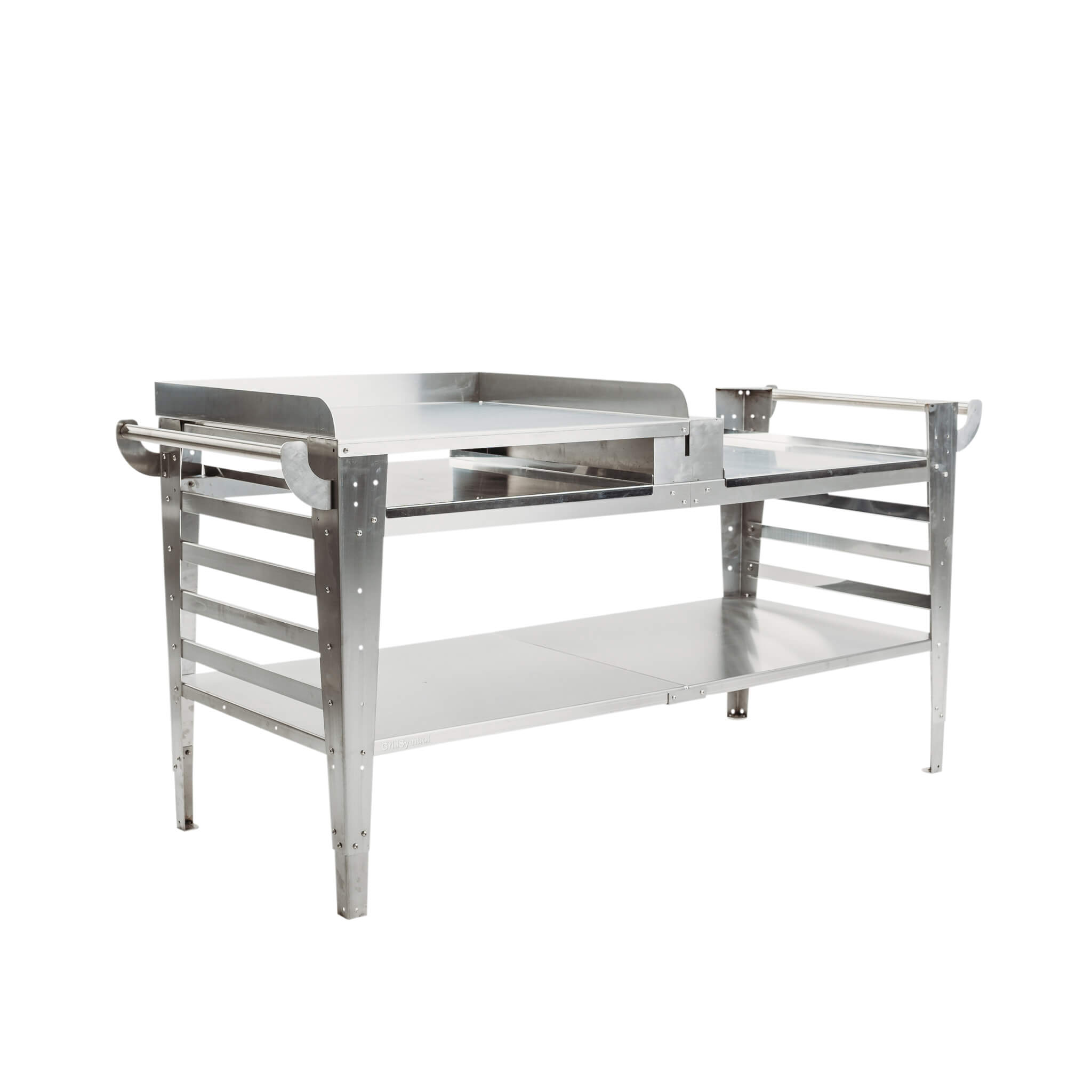 Pizzabord från GrillSymbol Baso XL som kan användas med GrillSymbols pizzaugn Pizzo. XL-bordet är stort och praktiskt och är designat utifrån funktionalitet. Det finns 2 nivåer där du kan förvara ved och placera tillbehör. Mindre tillbehör kan hängas på handtagen.