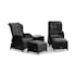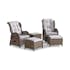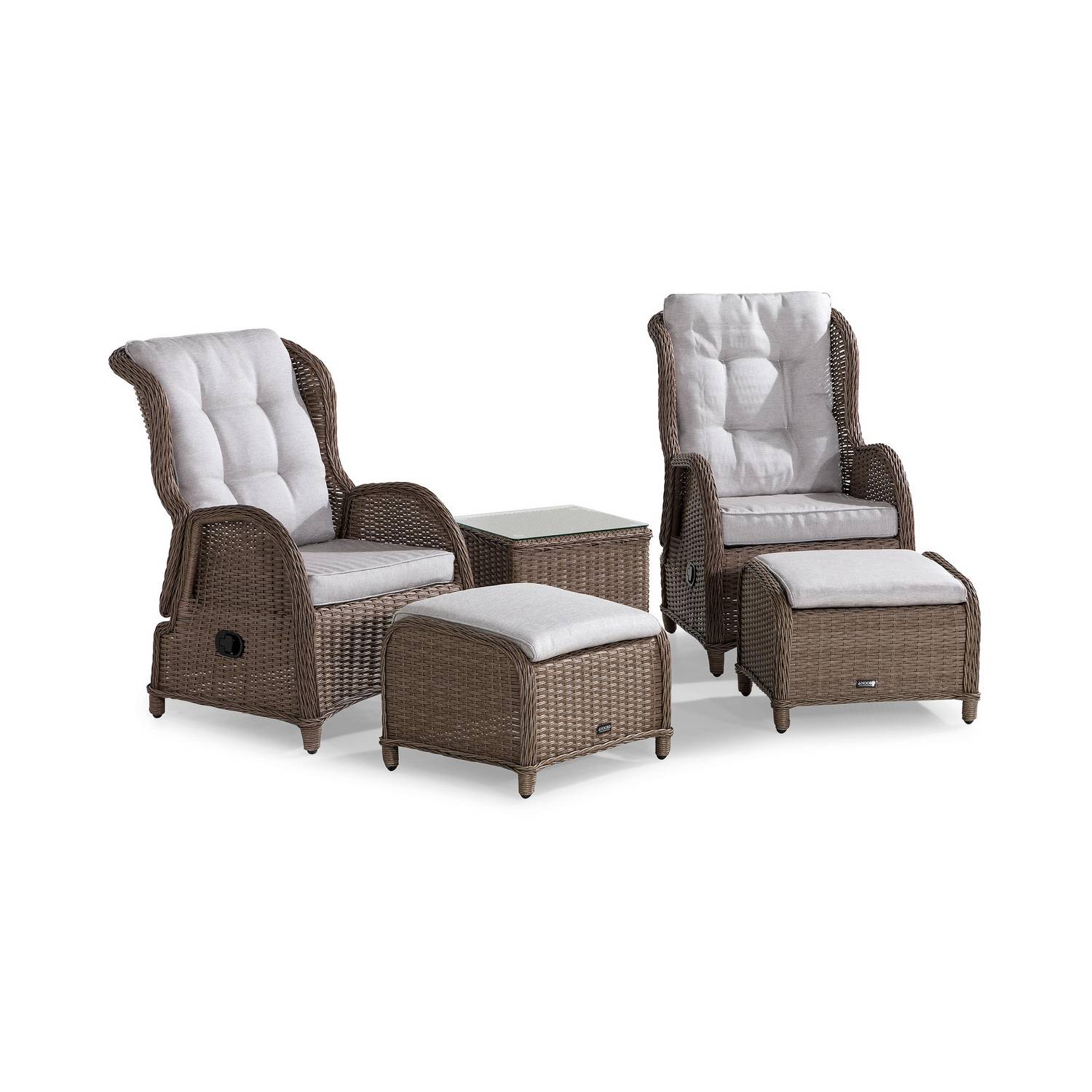 Möblerna är tillverkade i väderbeständig konstrotting vilket gör att de tål att stå ute länge, i såväl regn som solsken. Stilfullt caféset med skön komfort. Cafésetet består av två reclinerfåtöljer med fotpallar och ett sidobordTillhörande dynor medföljer. Fåtöljernas ryggstöd är fällbart. Såväl fåtöljer som fotpallar har en mjukt formad design vilket skapar en lyxig och stilfull känsla.