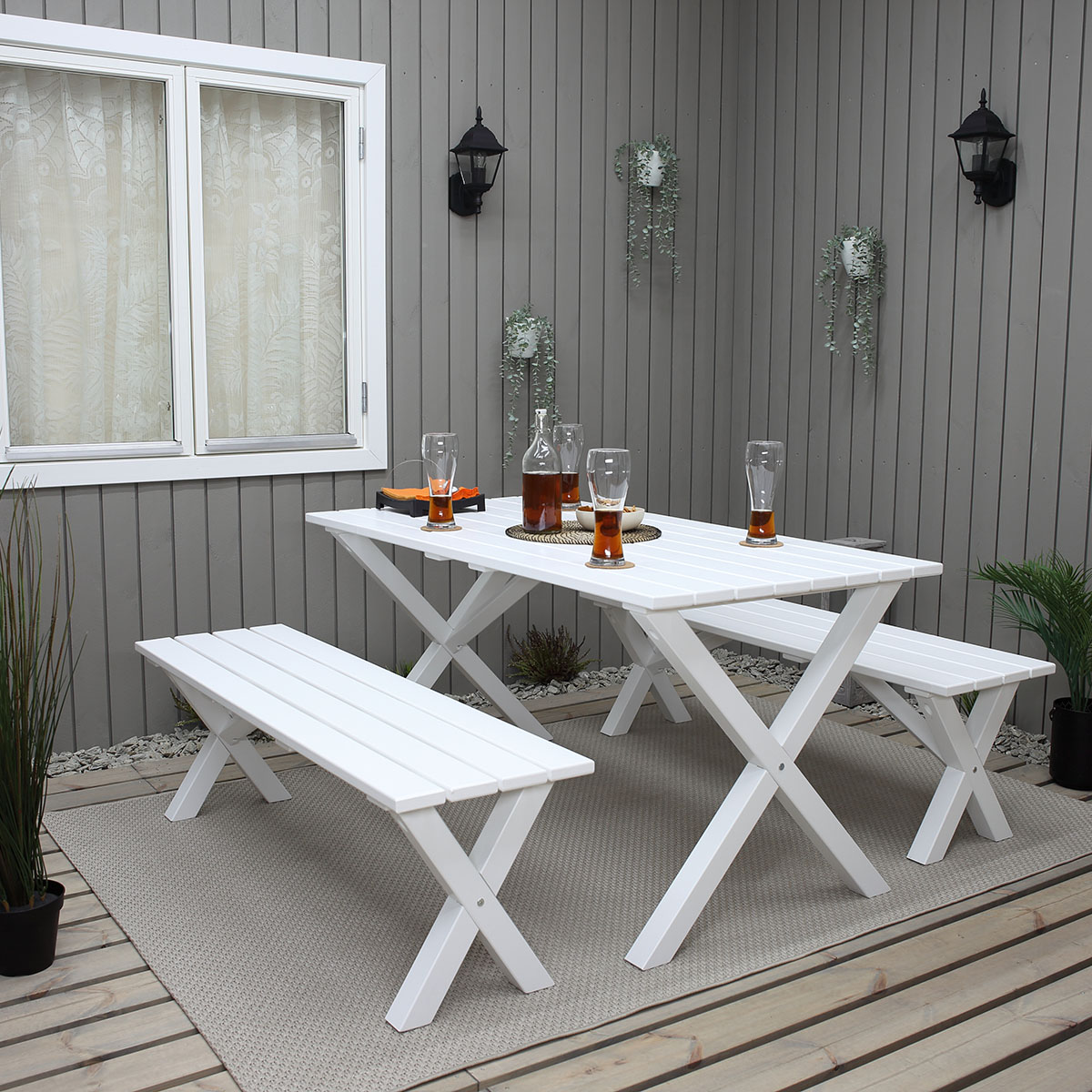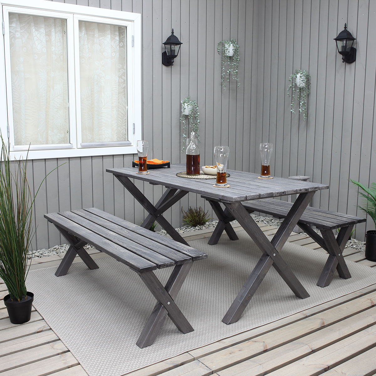 Matgrupp med snyggt designade ben. Matgruppen består av ett matbord och 2 bänkar. En klassisk rustik och samtidigt modern möbelgrupp som gör sig bra samtidigt på gräsmark och uteplats.