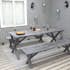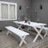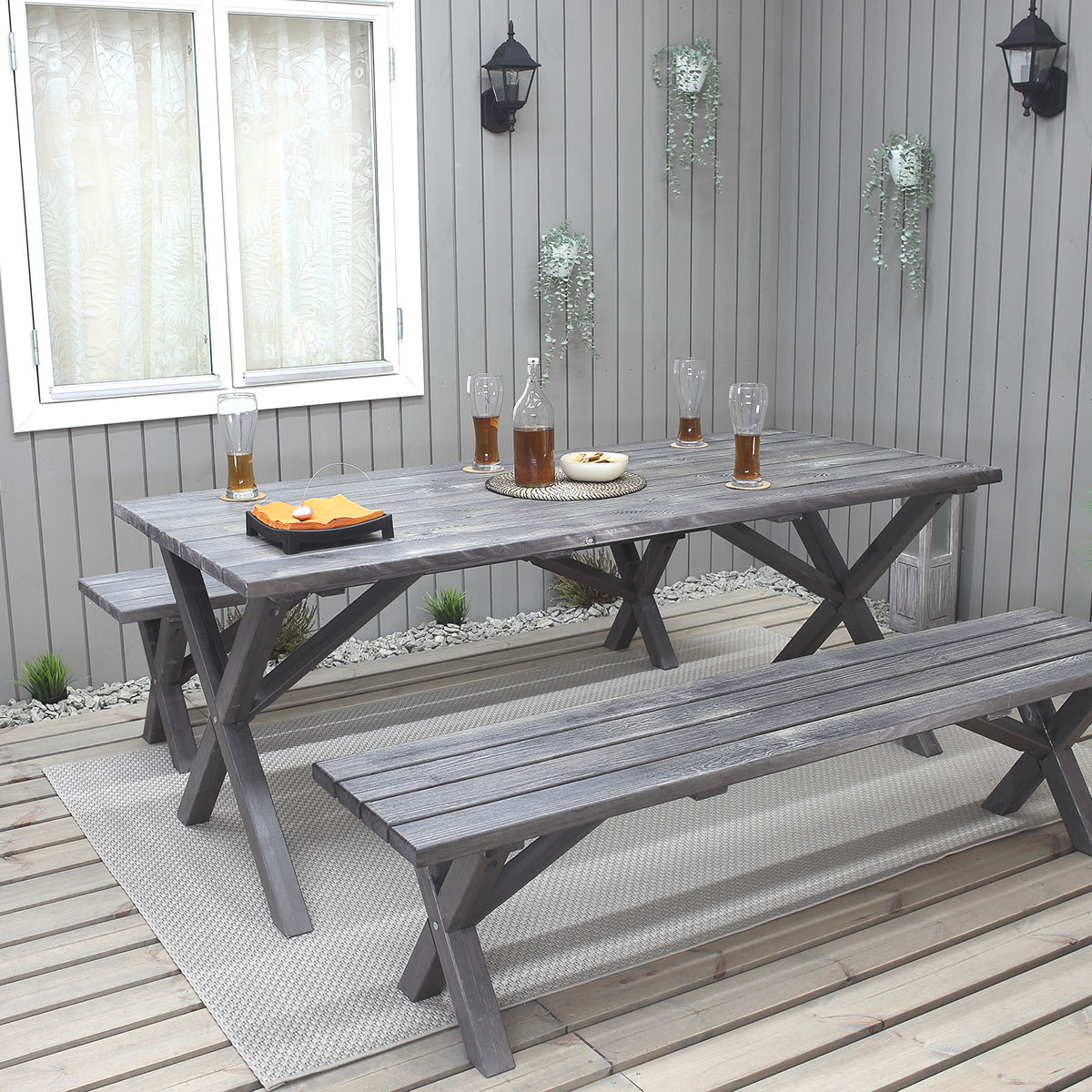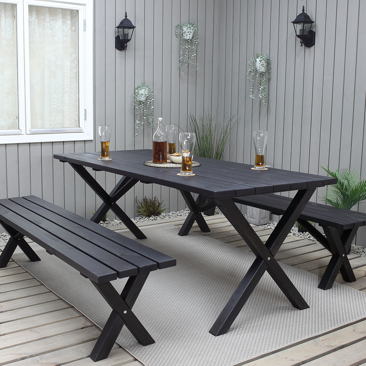 Matgrupp med snyggt designade ben. Matgruppen består av ett matbord och 2 bänkar. En klassisk rustik och samtidigt modern möbelgrupp som gör sig bra samtidigt på gräsmark och uteplats.