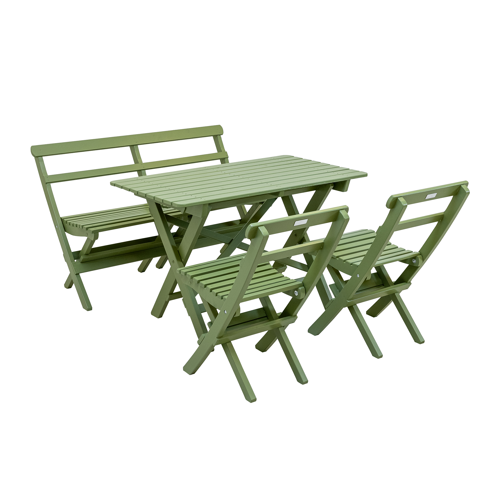 Matgrupp Torparen från Eden Wood består av 1 st bord, 2 st fällstolar och 1 st 2-sits soffa. Samtliga produkter går att fälla ihop för enkel förvaring och förflyttning. De är tillverkade i norrländsk FSC-furu.