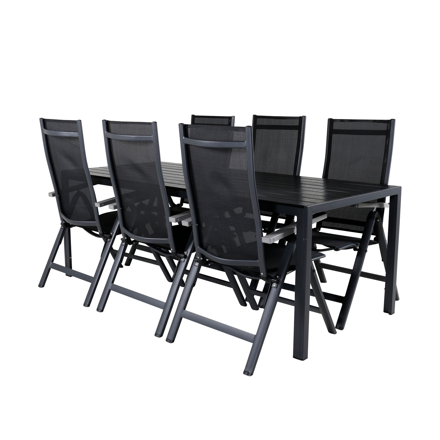 Matgrupp från Venture Home. Samla ihop dina vänner och njut tillsammans av en solig dag i trädgården runt denna matgrupp. Matbordet Bront har bordsben i aluminium och en bordsskiva i polywood. Matchas med 6 st Aleyna positionsstolar, fällbara i 5 olika lägen. Stolens sits är tillverkad av textilene och stolsbenen är i aluminium. Enklare montering krävs.