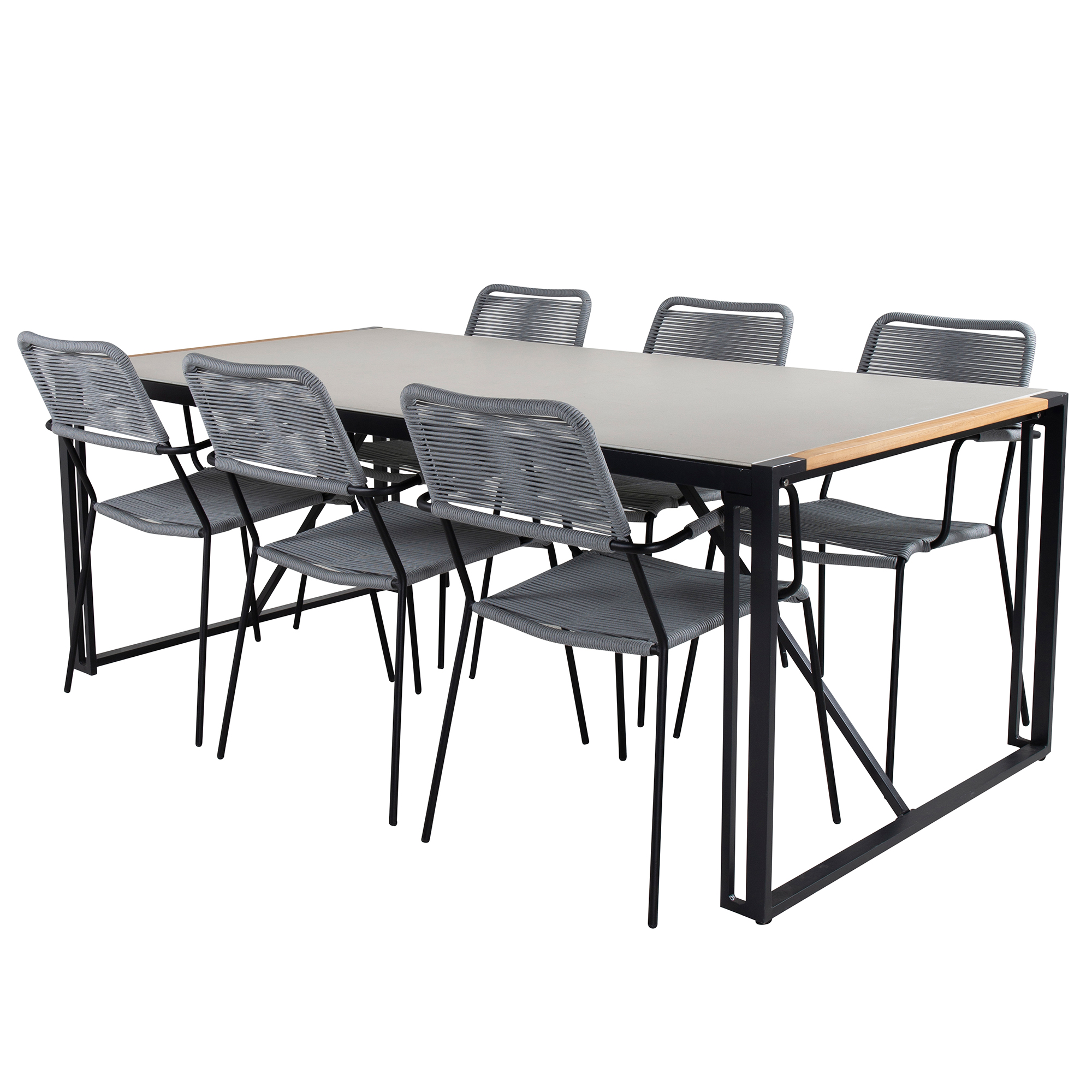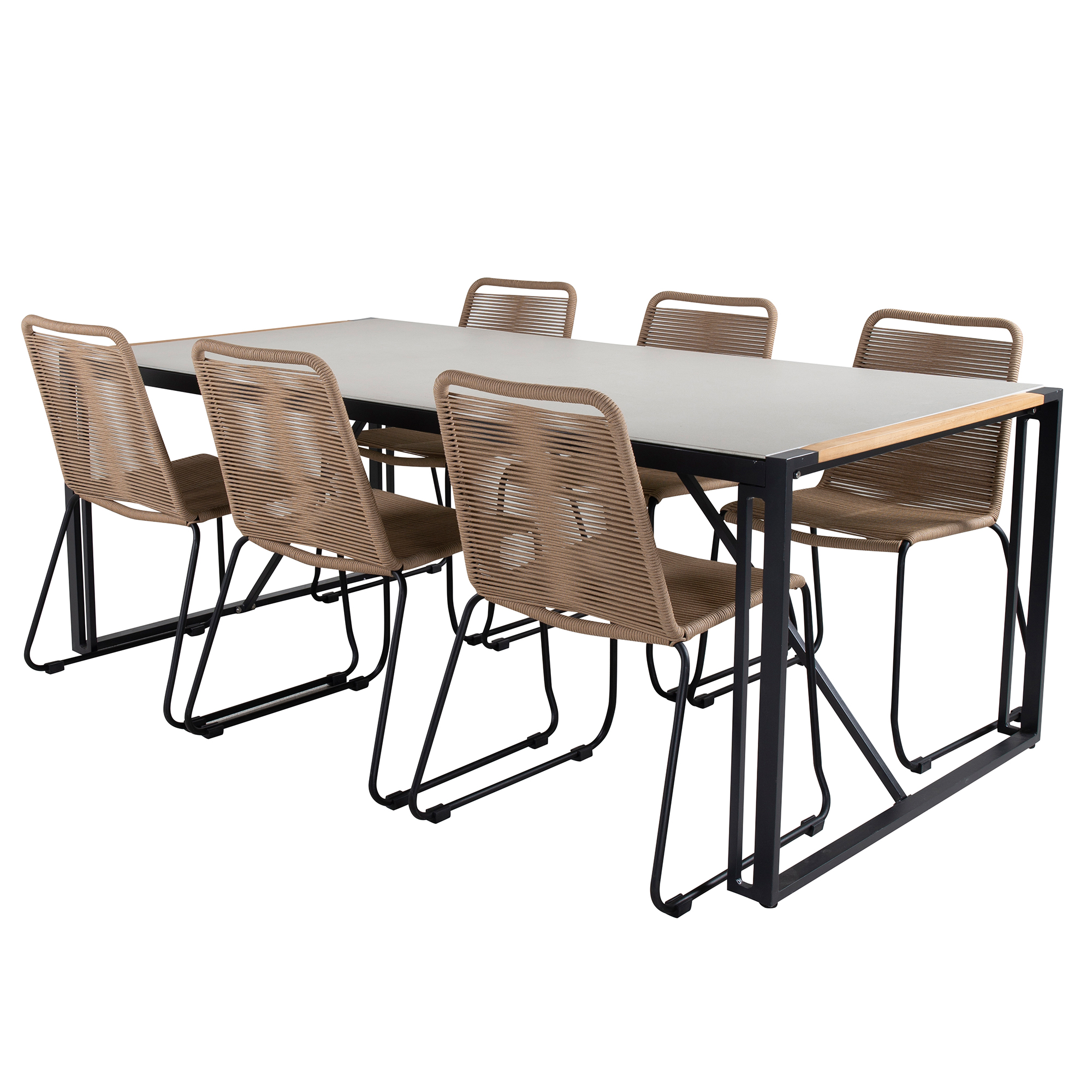 Skapa en härlig och inbjudande känsla i din trädgård med denna stilsäkra matgrupp. Matgrupp Texas med bordskiva i i glas och teak. Matgruppen kommer tillsammans med 6st Lindos matstolar med en ram i svart stål och en sits i rep.