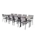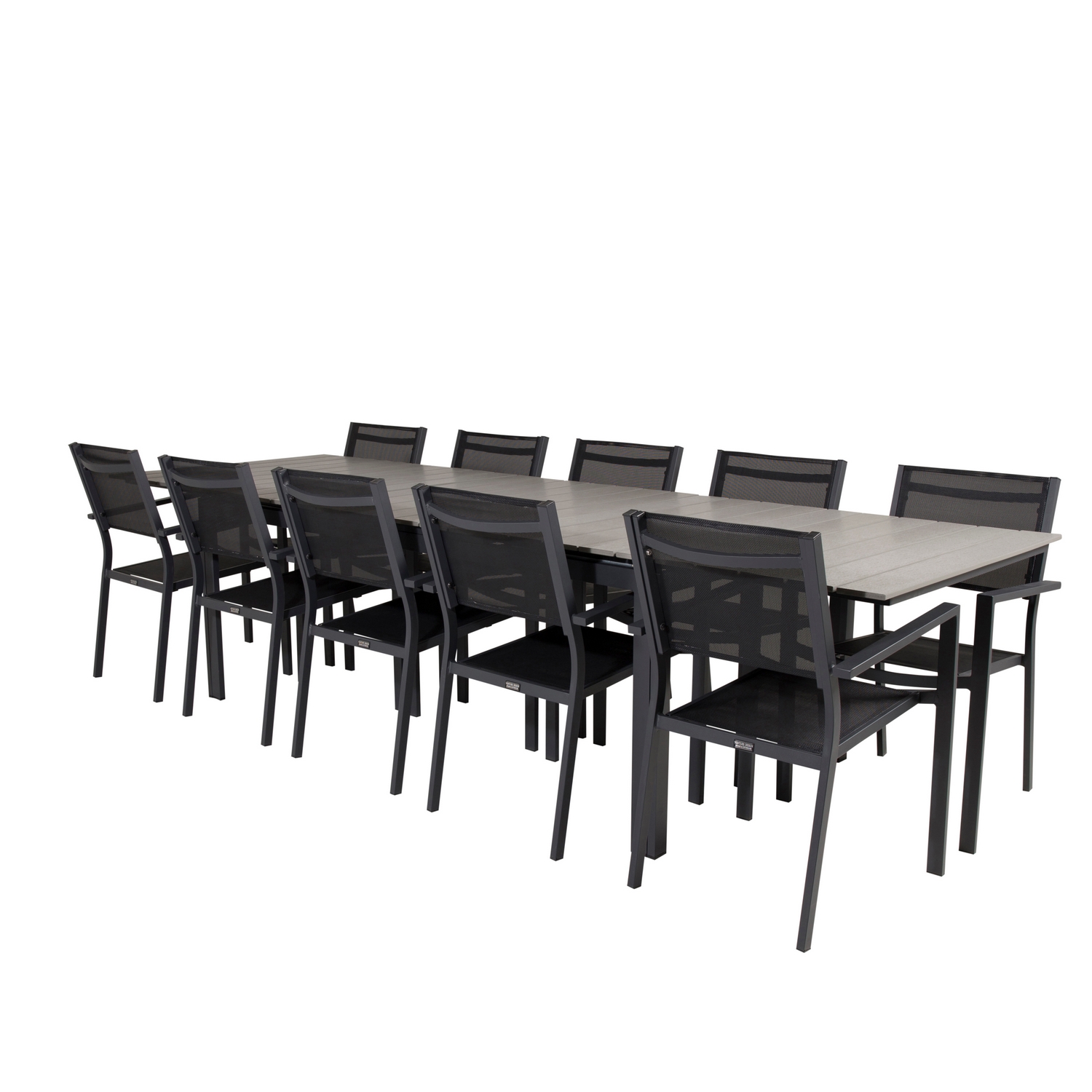 Matgrupp Lova 224/324 med 10 Copacabana Karmstolar från Venture Home är en matgrupp för uteplats eller trädgård med plats för många. Bordet är förlängningsbart och är tillverkat av aluminium med en bordsskiva i Aintwood. De medföljande tio stolarna är stapelbara och tillverkade av aluminium och Textilene. Denna grupp kräver lättare montering.
