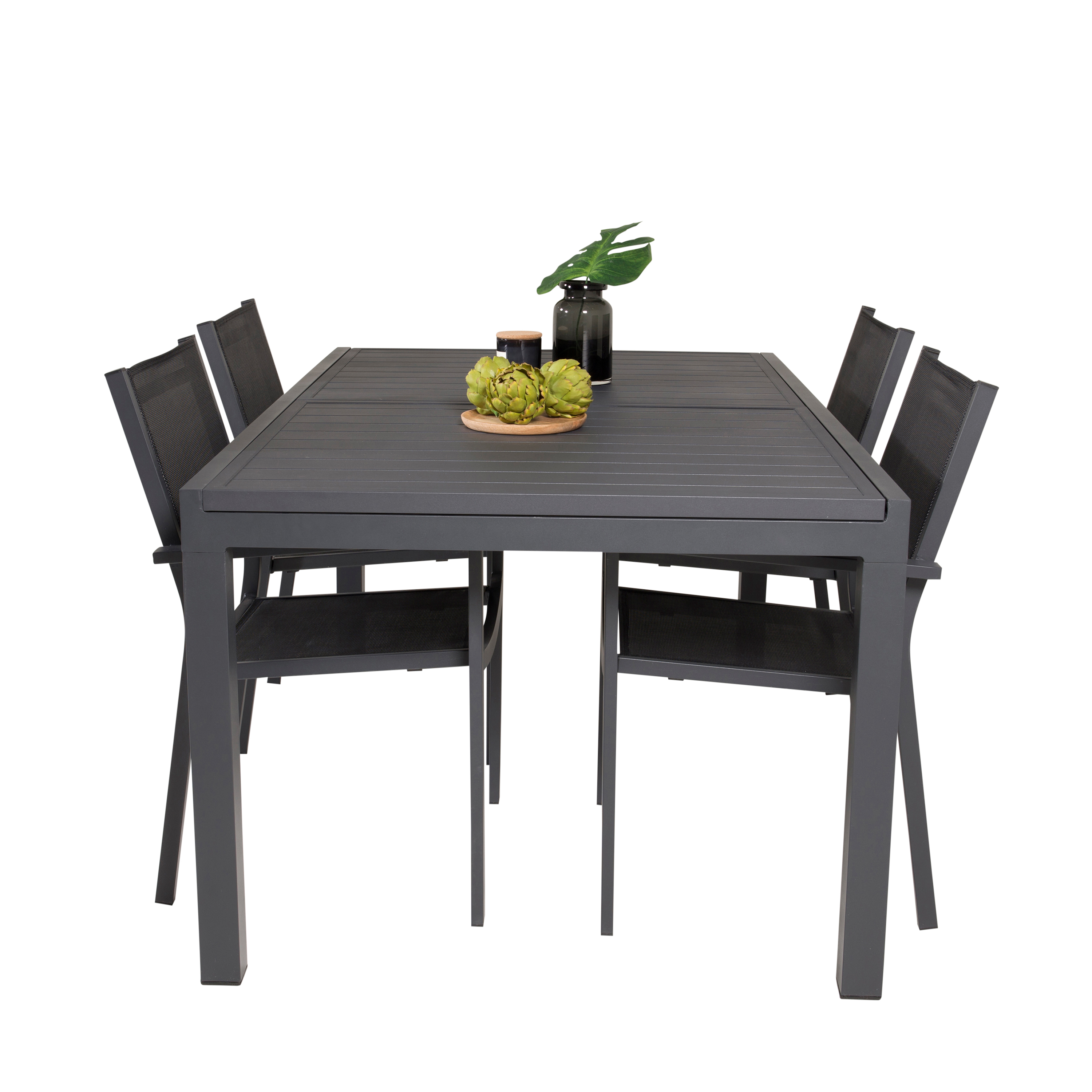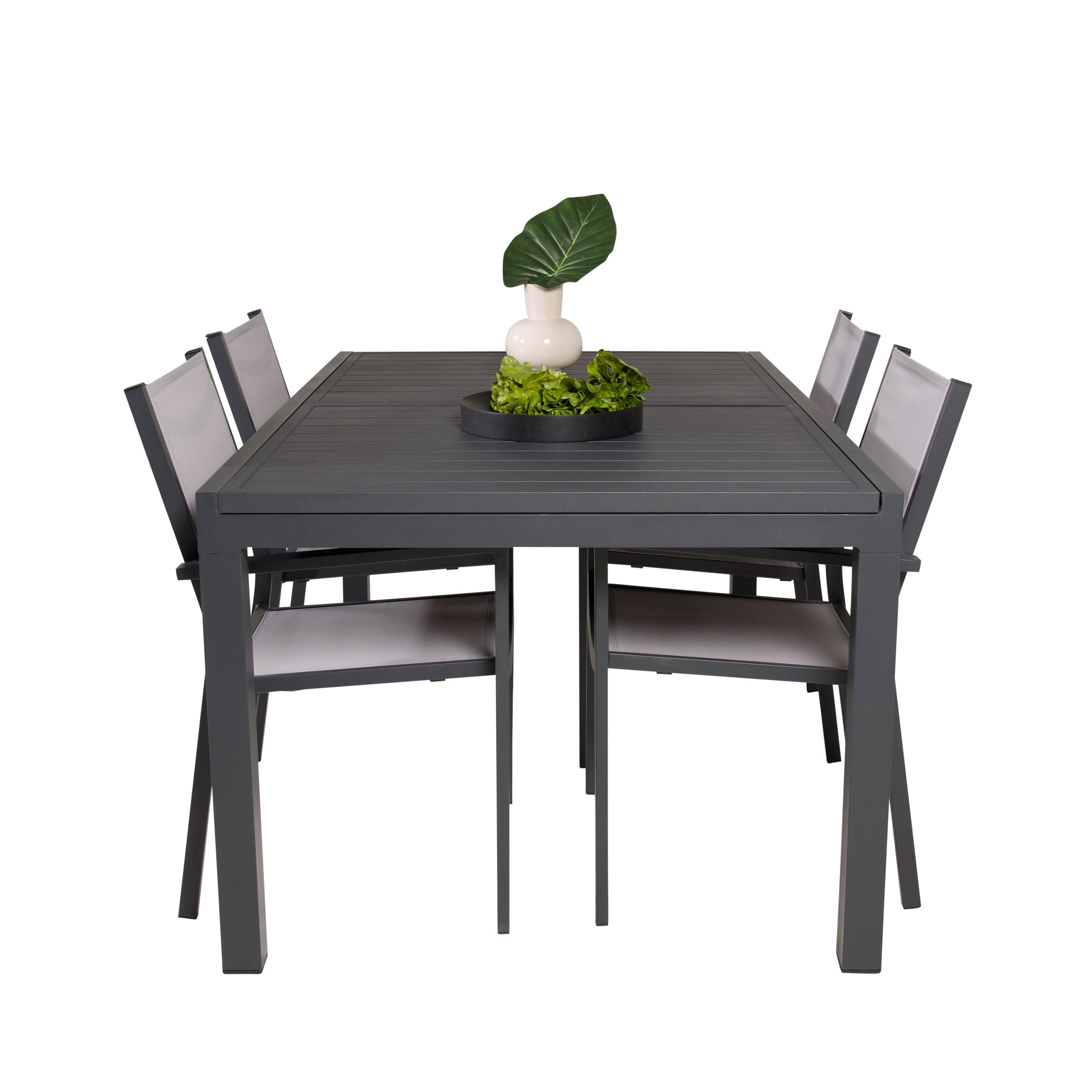Matgrupp Venture Home Madrid med fyra stycken Copacabana stolar. Bordet har en iläggsskiva som gör att du kan förlänga bordet från 1600 till 2400 mm.