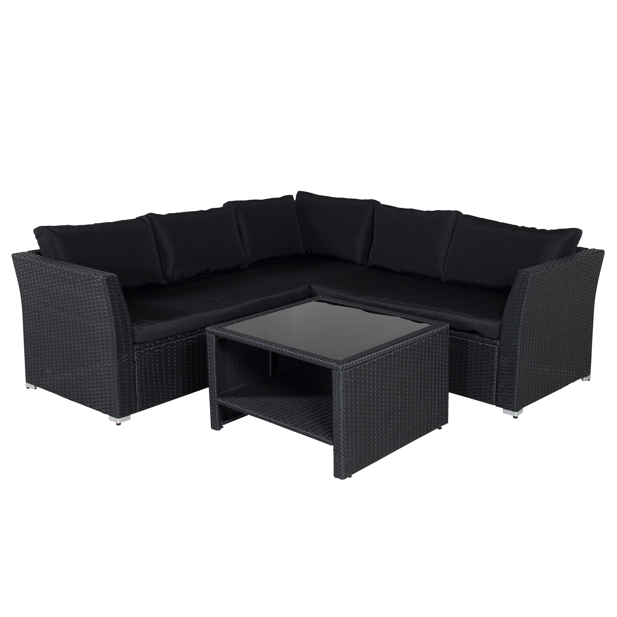 Soffgrupp Harlan från Venture Home. Skön och snygg soffgrupp i svart stål med tillhörande bord och en toppskiva i glas. Gruppen rymmer totalt 4 personer. Enklare montering krävs. Slitstarka dynor medföljer.