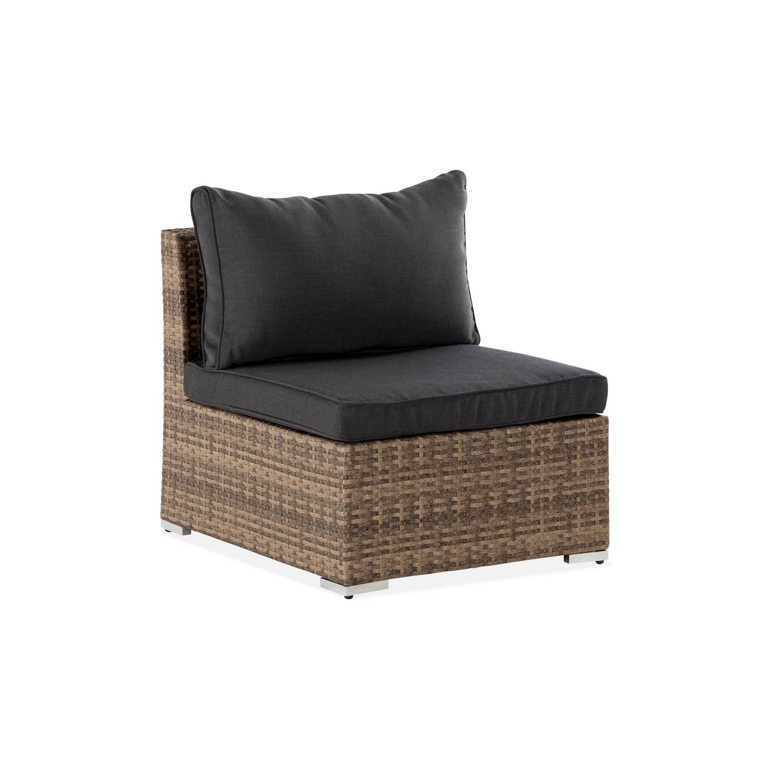 Modulerna finns i flera olika modeller: mittmodul, hörnmodul och divan/pall. Välj mellan färgerna svart, grå/brun, ljusgrå och sand. Tillverkade i det näst intill underhållsfria materialet konstrotting. Dynor i vattenavvisande tyg ingår.