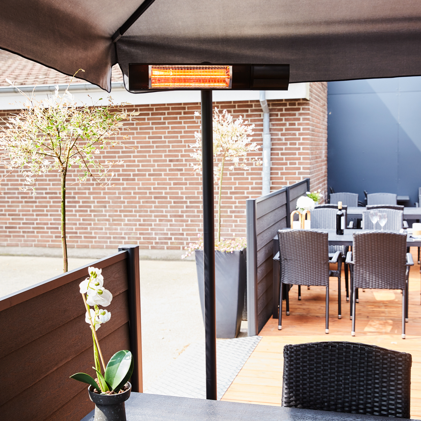 Effektiv, fristående, infraröd, kortvågs-terrassvärmare från HORTUS. Perfekt för terrassen, uterummet eller balkongen. Placeras terrassvärmaren vid änden av ett bord ger den behaglig värme i ett område på ca. 5 m2. Inbyggt, 1500W, infrarött, ultra low glare halogenrör som omvandlar 92 % av energin till behaglig värme, utan att värma upp luften runt terrassvärmaren. 3 effektnivåer på respektive 500, 1000 och 1500 W. Fjärrkontroll ingår. Ett skyddsöverdrag kan köpas till som extra tillbehör.