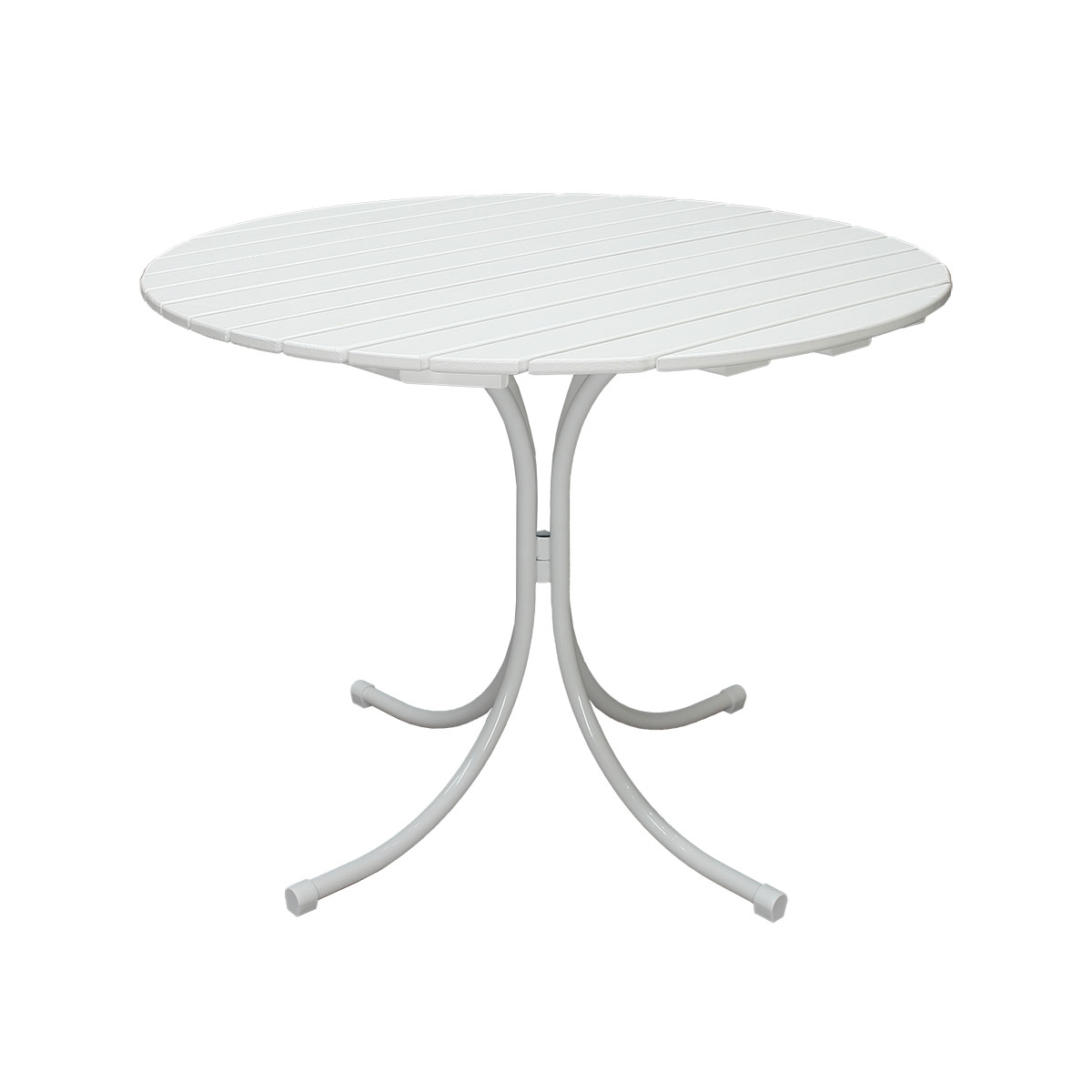 Matbord Baltic Garden Holm är ett elegant, runt bord i klassisk stil. Det har en stomme i lackat stål samt bordsribbor i FSC-märkt furu.
