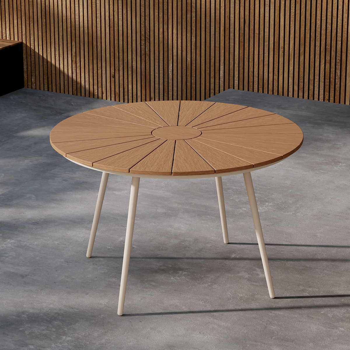 Möt San Vito – det runda, eleganta bordet som tar din uteplats till nästa nivå. Med en generös diameter på 120 cm erbjuder San Vito gott om plats för att samla familj och vänner runt härliga middagar utomhus. Bordet är tillverkat i hållbart aluminium med en vacker bordsskiva i plywood, vilket ger en perfekt balans mellan lätthet och stabilitet. Dess djupa beigea färg ger ett stilrent uttryck som smälter in i varje utomhusmiljö och skapar en inbjudande atmosfär. Med San Vito får du både funktion och design – det perfekta valet för att göra varje middag till en minnesvärd upplevelse.